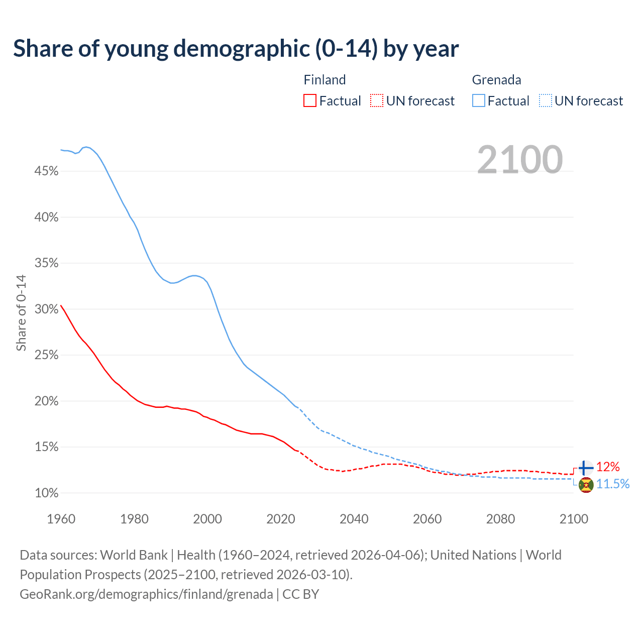 - The share of young demographic (0-15 years old) in Finland is 14.6% vs 19.4% in Grenada.