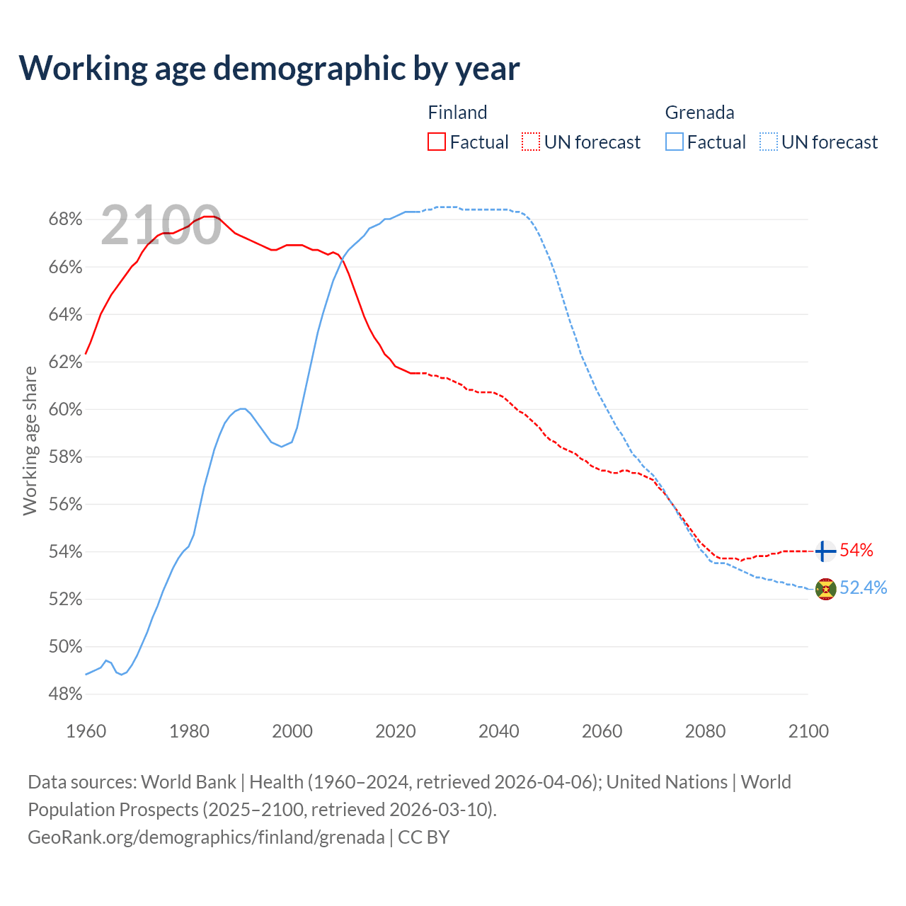 - Finland has 3.46M working age adults (aged 15-64) vs 80.2K in Grenada.