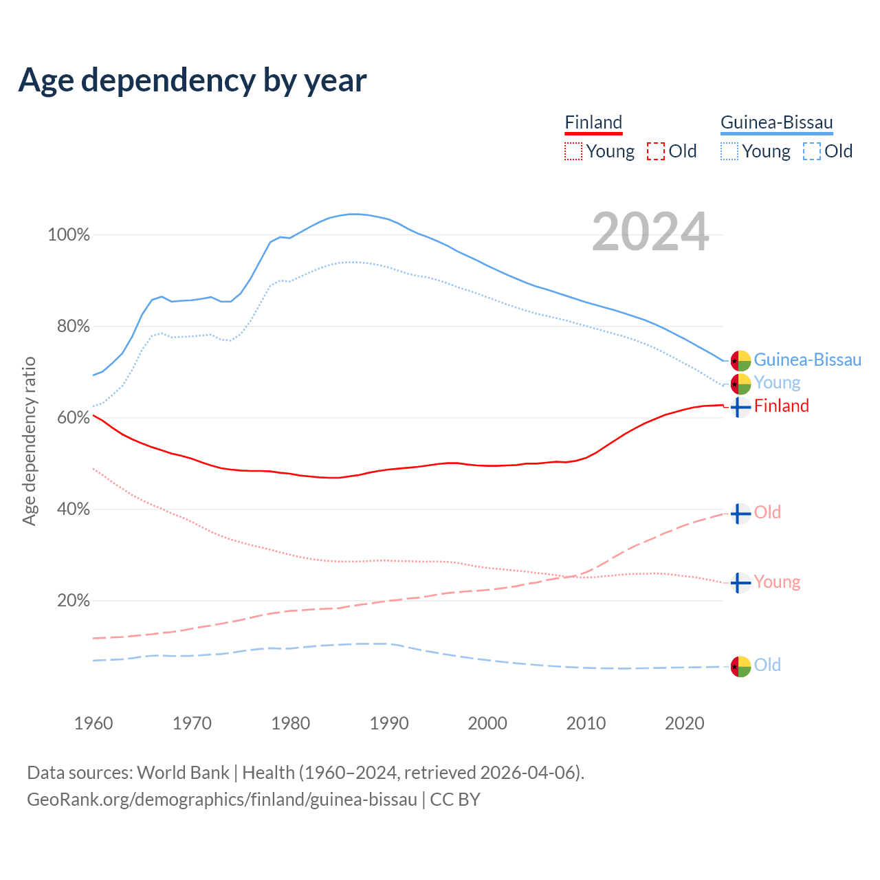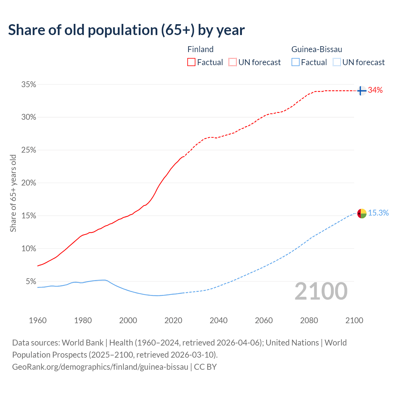 - The share of old-age demographic (65+) in Finland is 23.9% vs 3.19% in Guinea-Bissau.