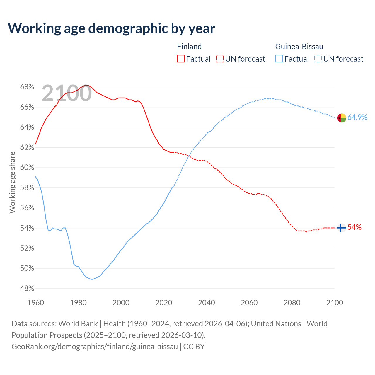 - Finland has 3.46M working age adults (aged 15-64) vs 1.34M in Guinea-Bissau.