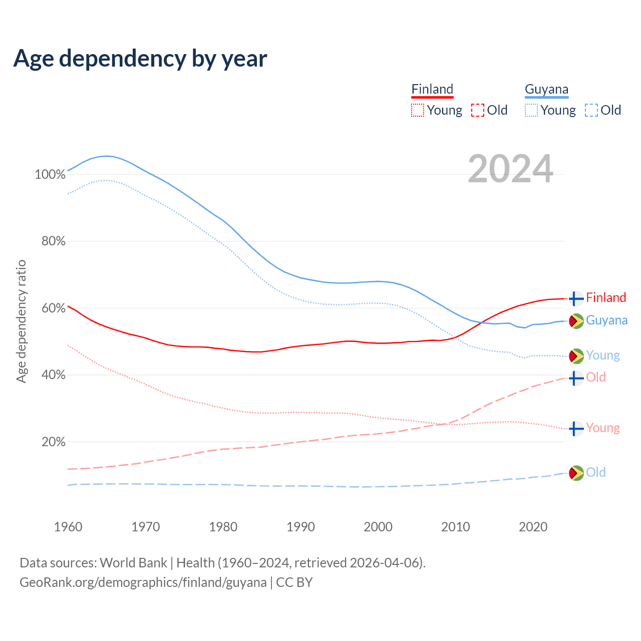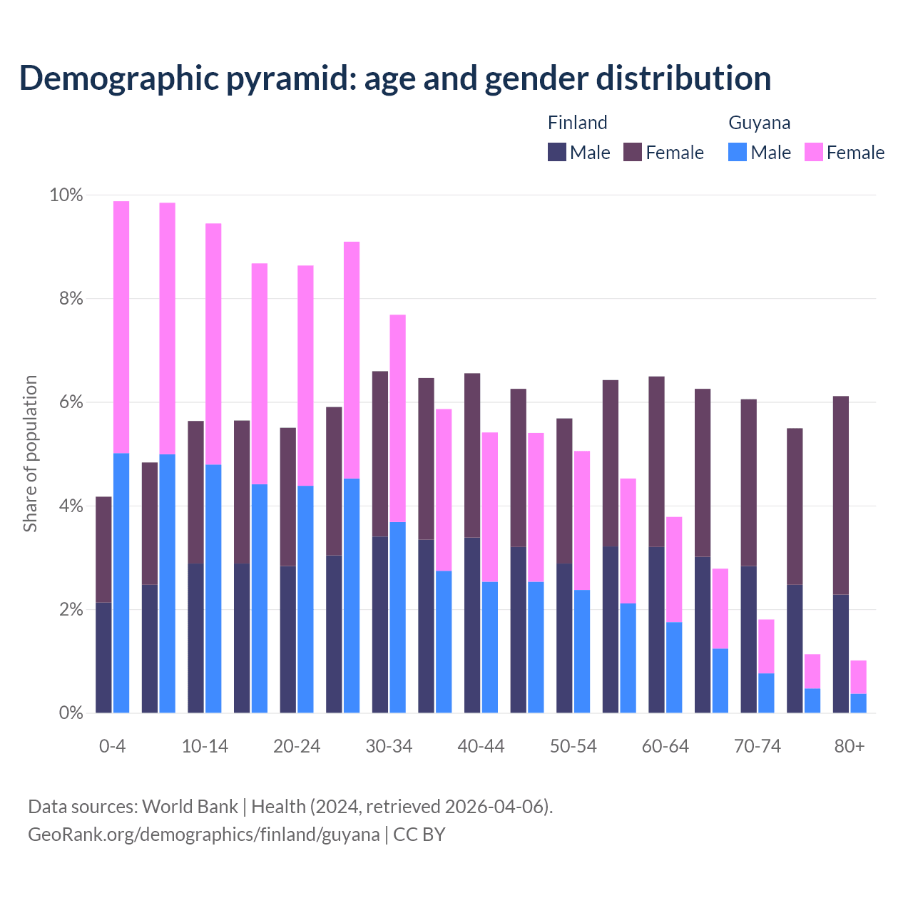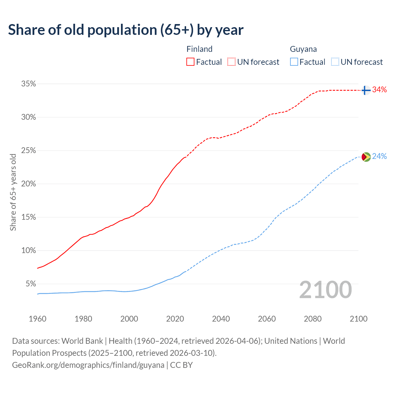 - The share of old-age demographic (65+) in Finland is 23.9% vs 6.73% in Guyana.