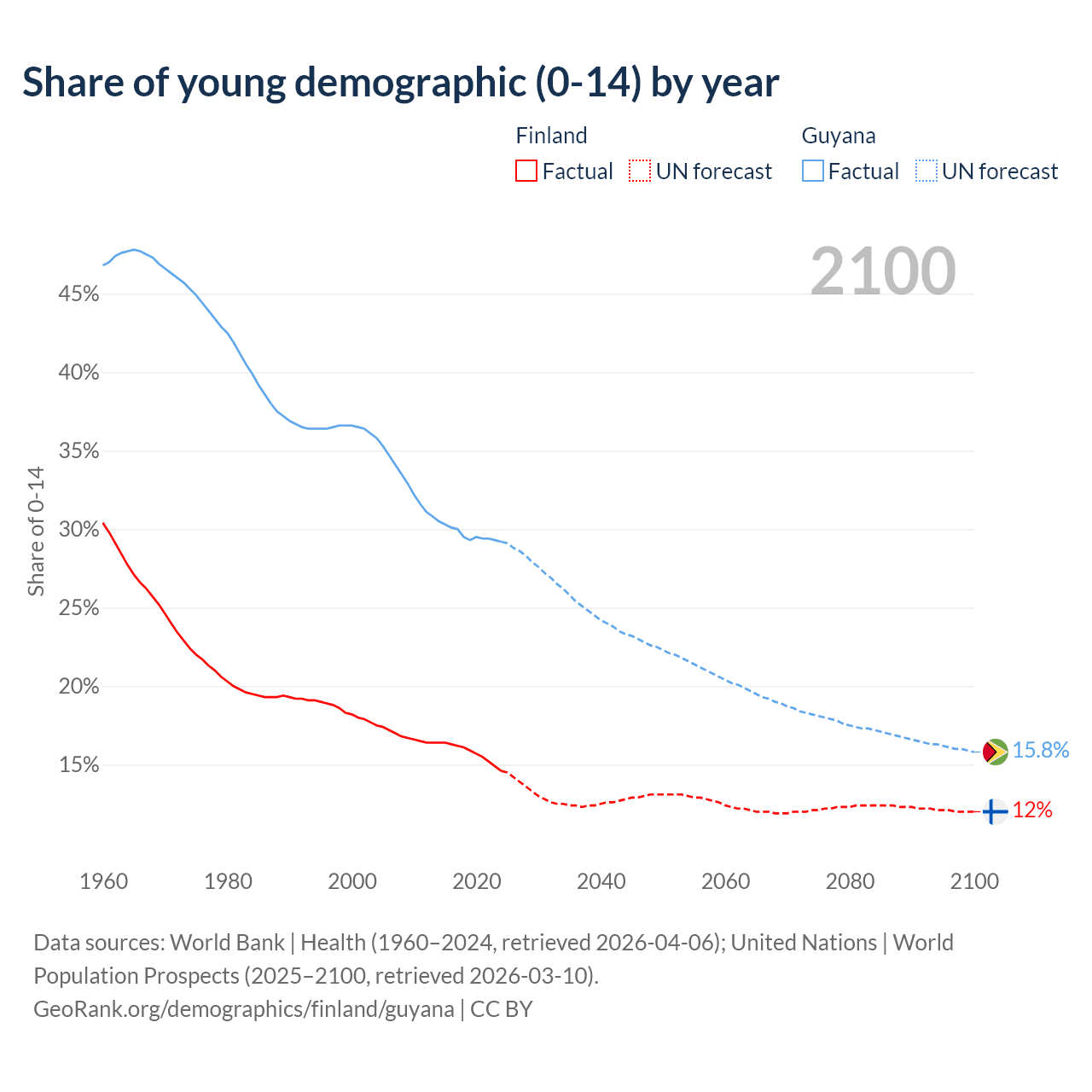 - The share of young demographic (0-15 years old) in Finland is 14.6% vs 29.2% in Guyana.