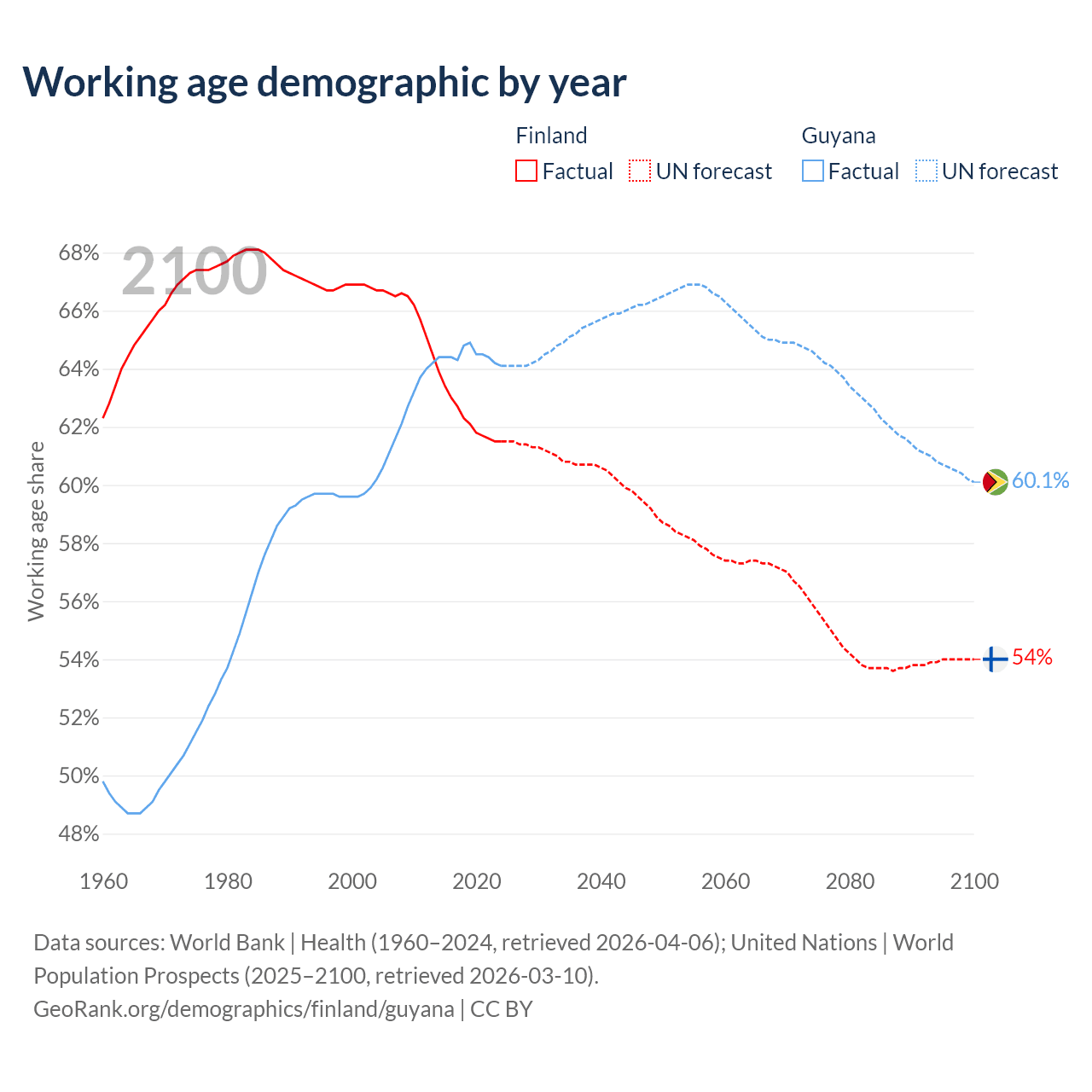 - Finland has 3.46M working age adults (aged 15-64) vs 540K in Guyana.
