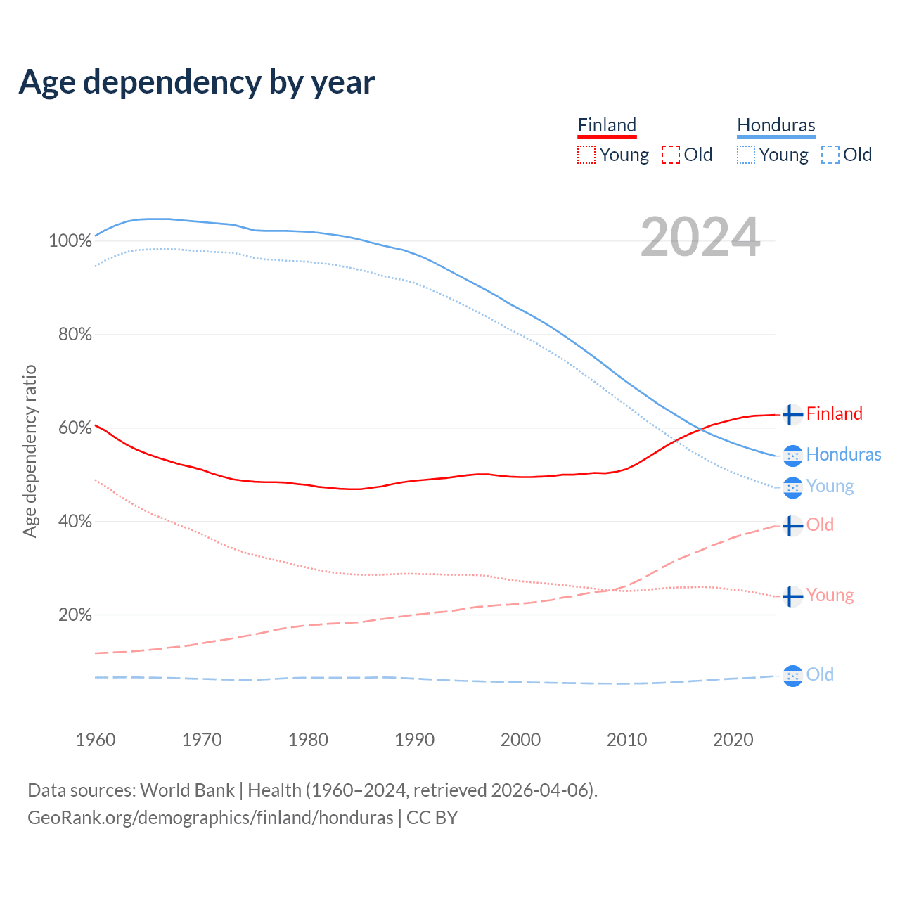 The share of older people aged 65 and over is 23.9% in Finland and 4.42% in Honduras. Life expectancy in Finland compared to Honduras .
