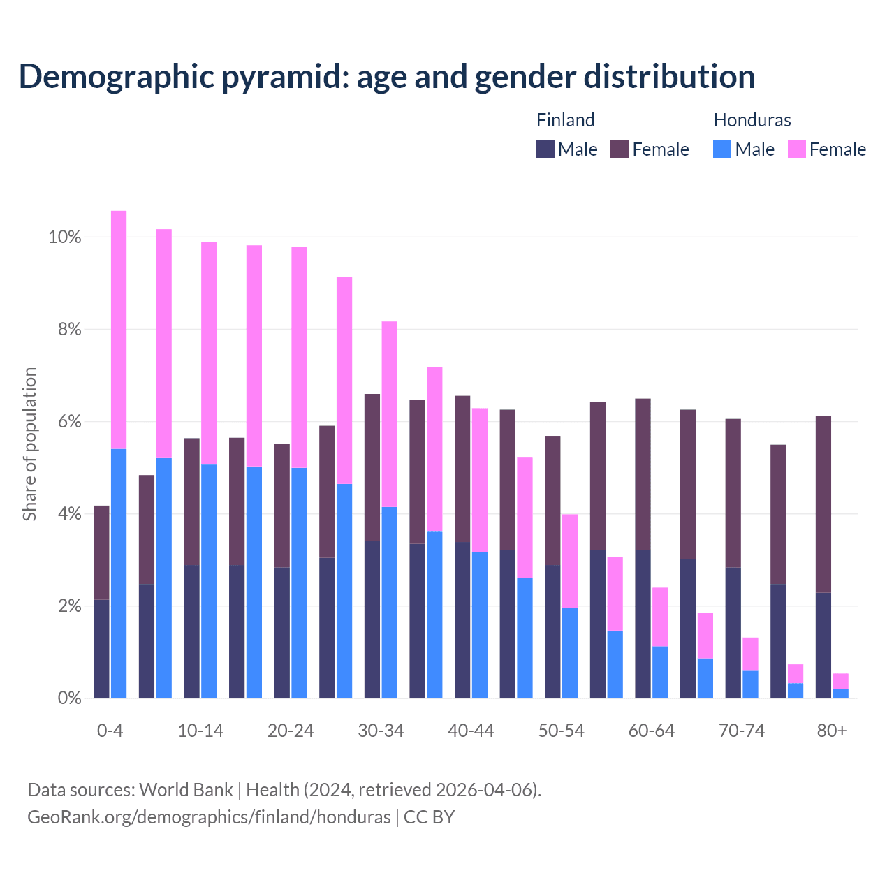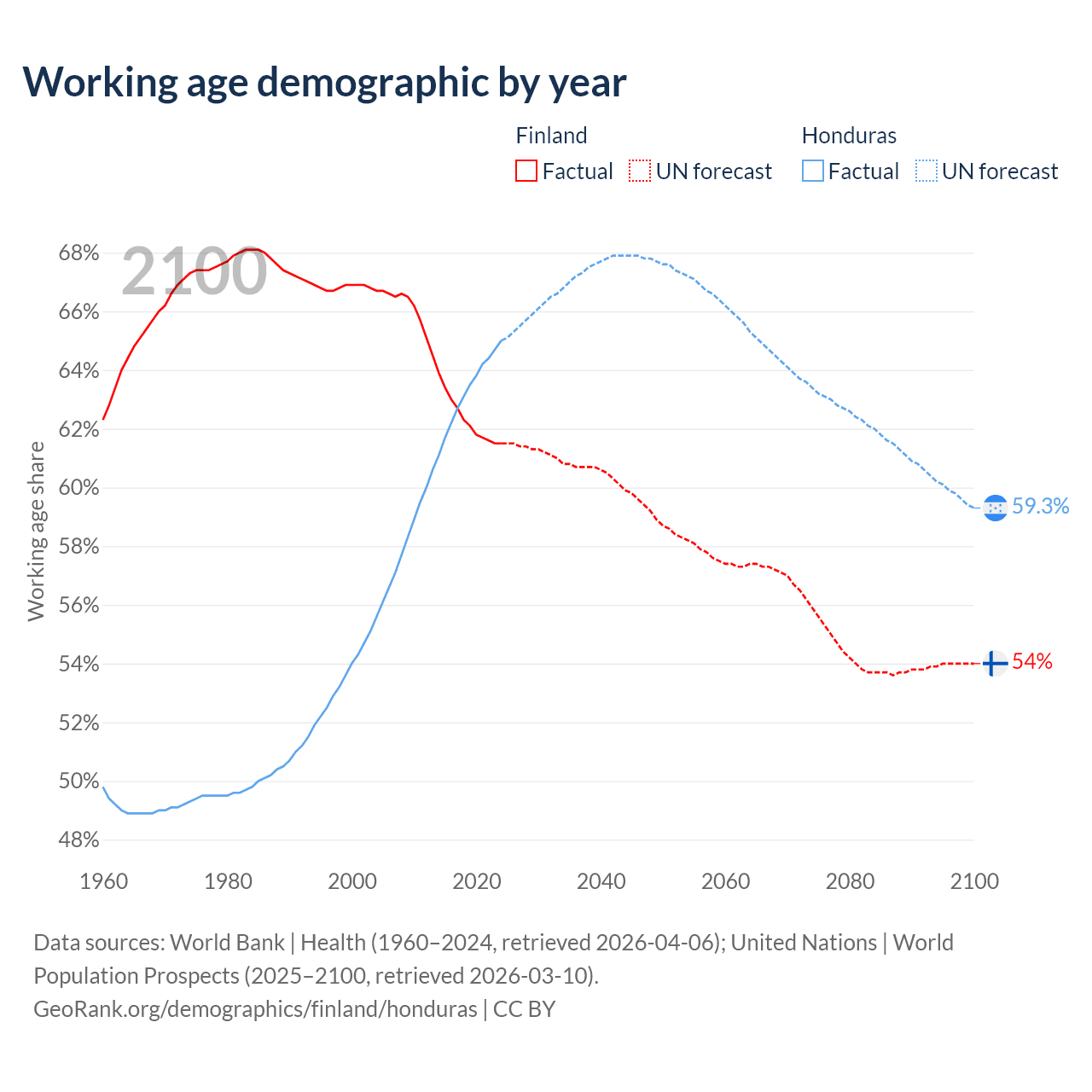 - As of 2026, the population of Finland is 5.63M vs 11.2M in Honduras - 2 times difference.