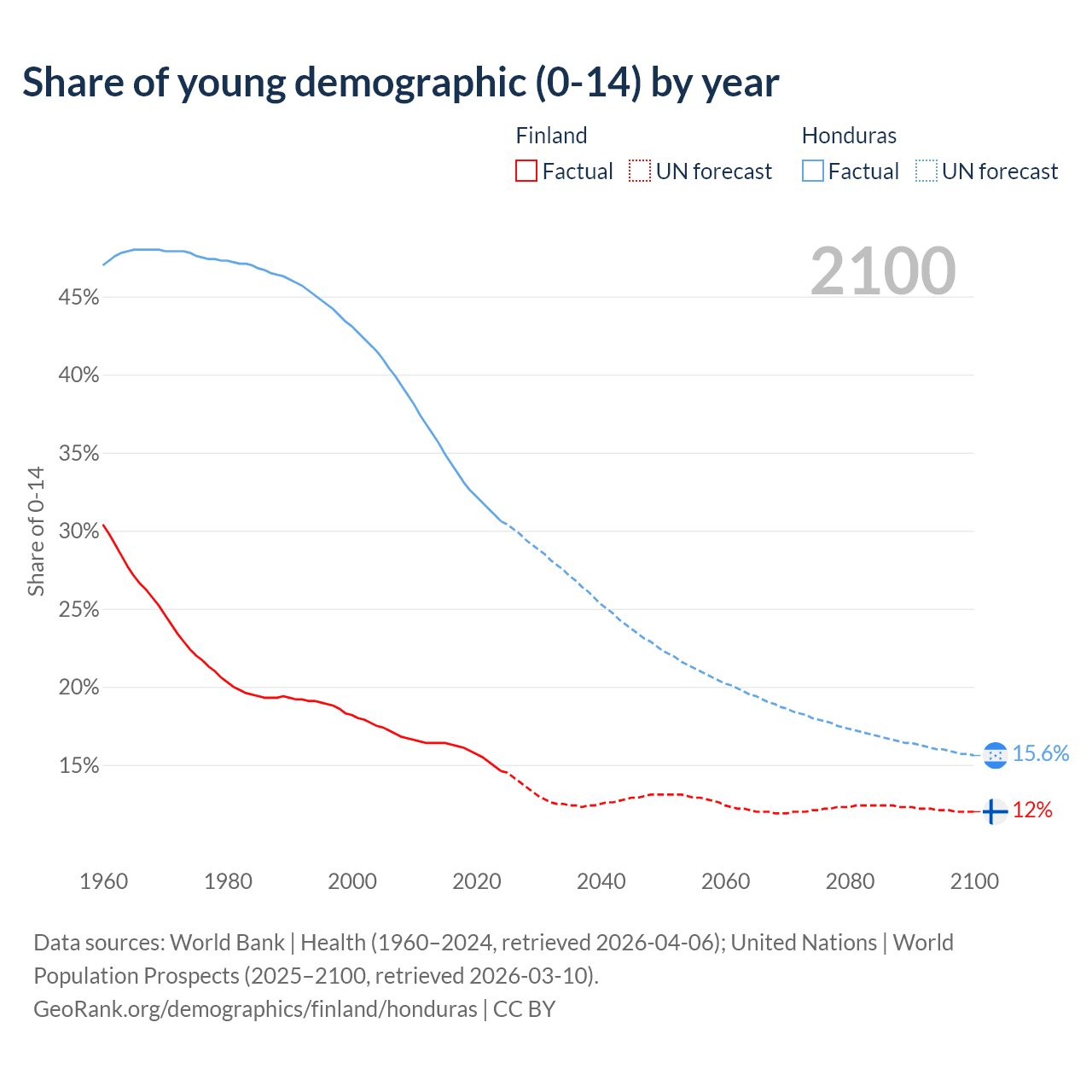- The share of young demographic (0-15 years old) in Finland is 14.6% vs 30.6% in Honduras.