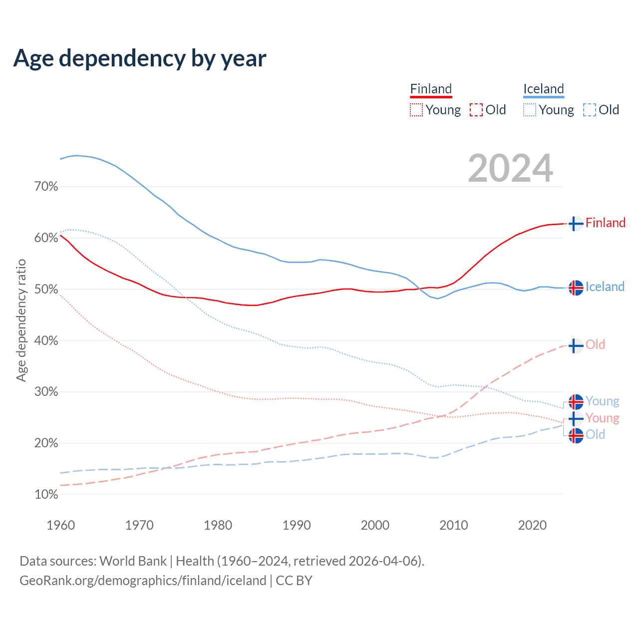- The share of old-age demographic (65+) in Finland is 23.9% vs 15.6% in Iceland.