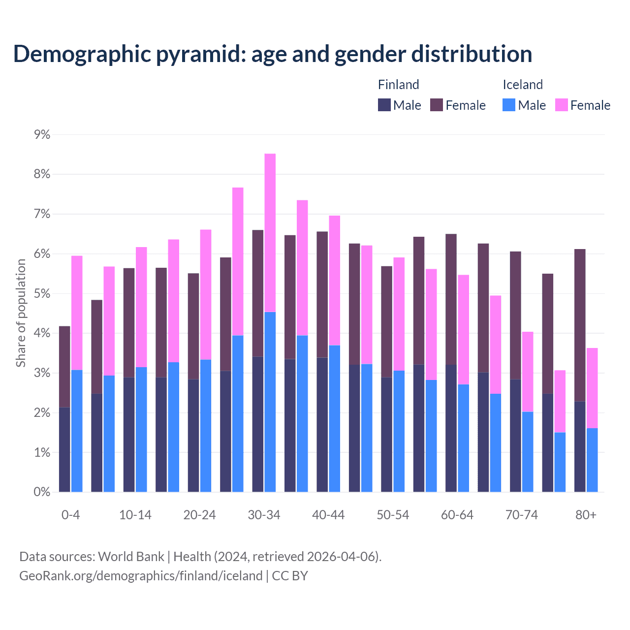 - Finland is ranked 22/196 by median age (oldest to youngest) vs 65/196 for Iceland.