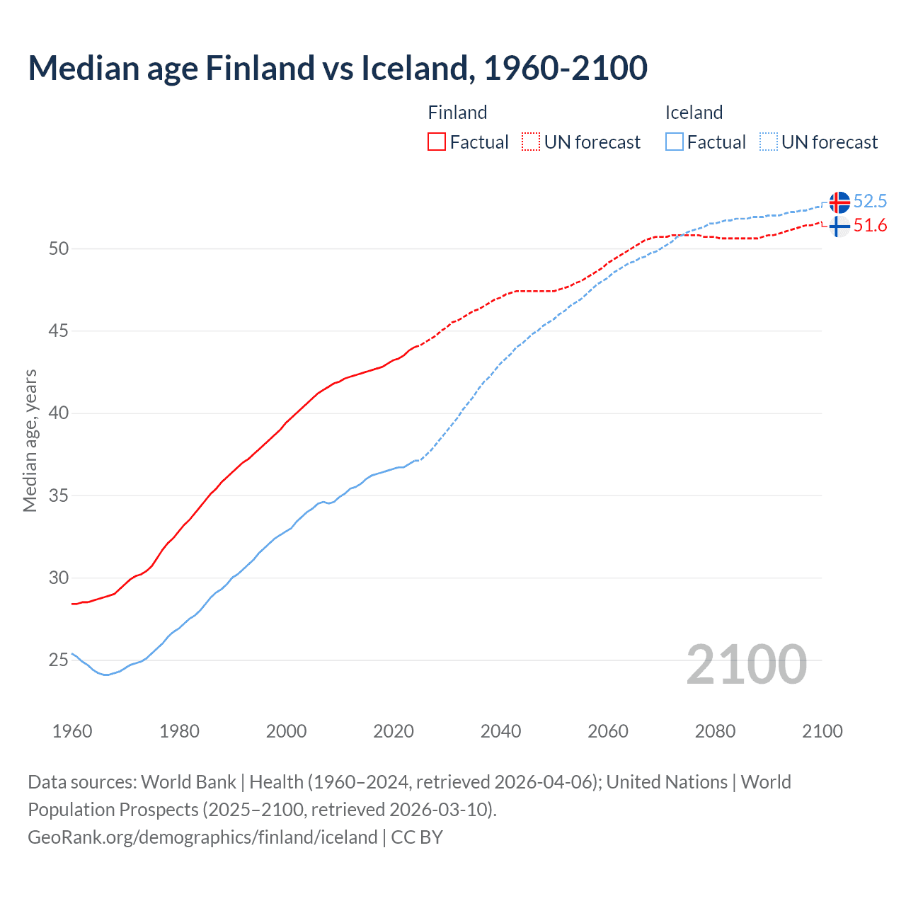 - The median age in Finland is 44 years compared to 37.1 years in Iceland.