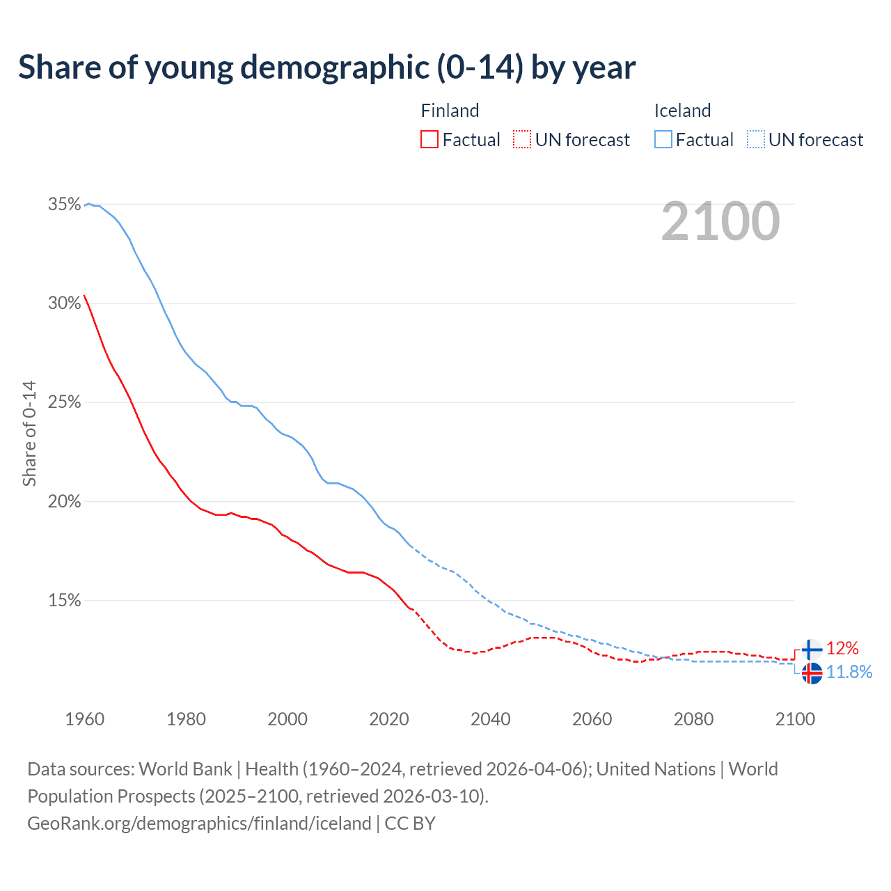 - The share of young demographic (0-15 years old) in Finland is 14.6% vs 17.8% in Iceland.