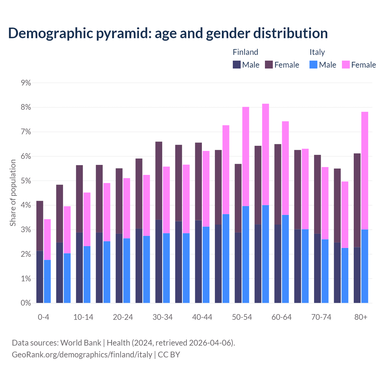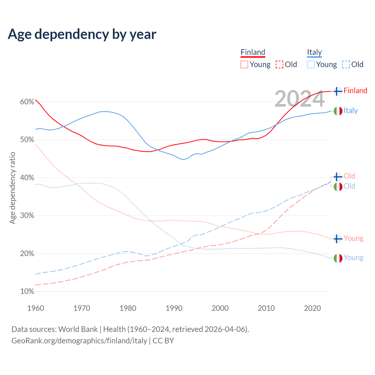 - Finland is ranked 22/196 by median age (oldest to youngest) vs 4/196 for Italy.
