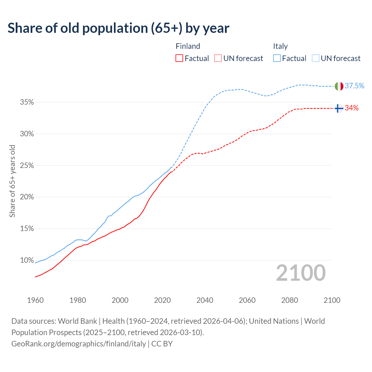 The share of older people aged 65 and over is 23.9% in Finland and 24.6% in Italy. Life expectancy in Finland compared to Italy .