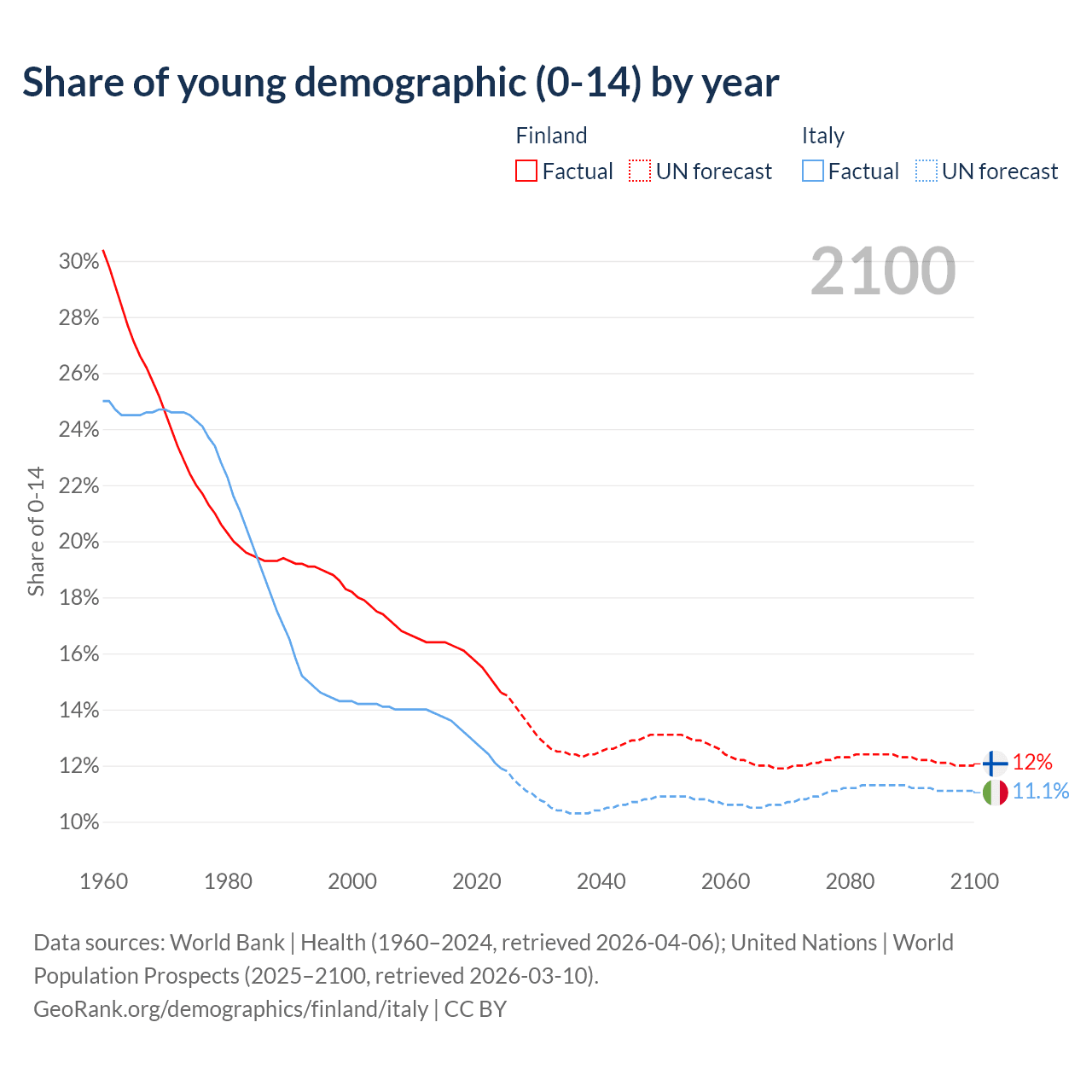 - The share of young demographic (0-15 years old) in Finland is 14.6% vs 11.9% in Italy.