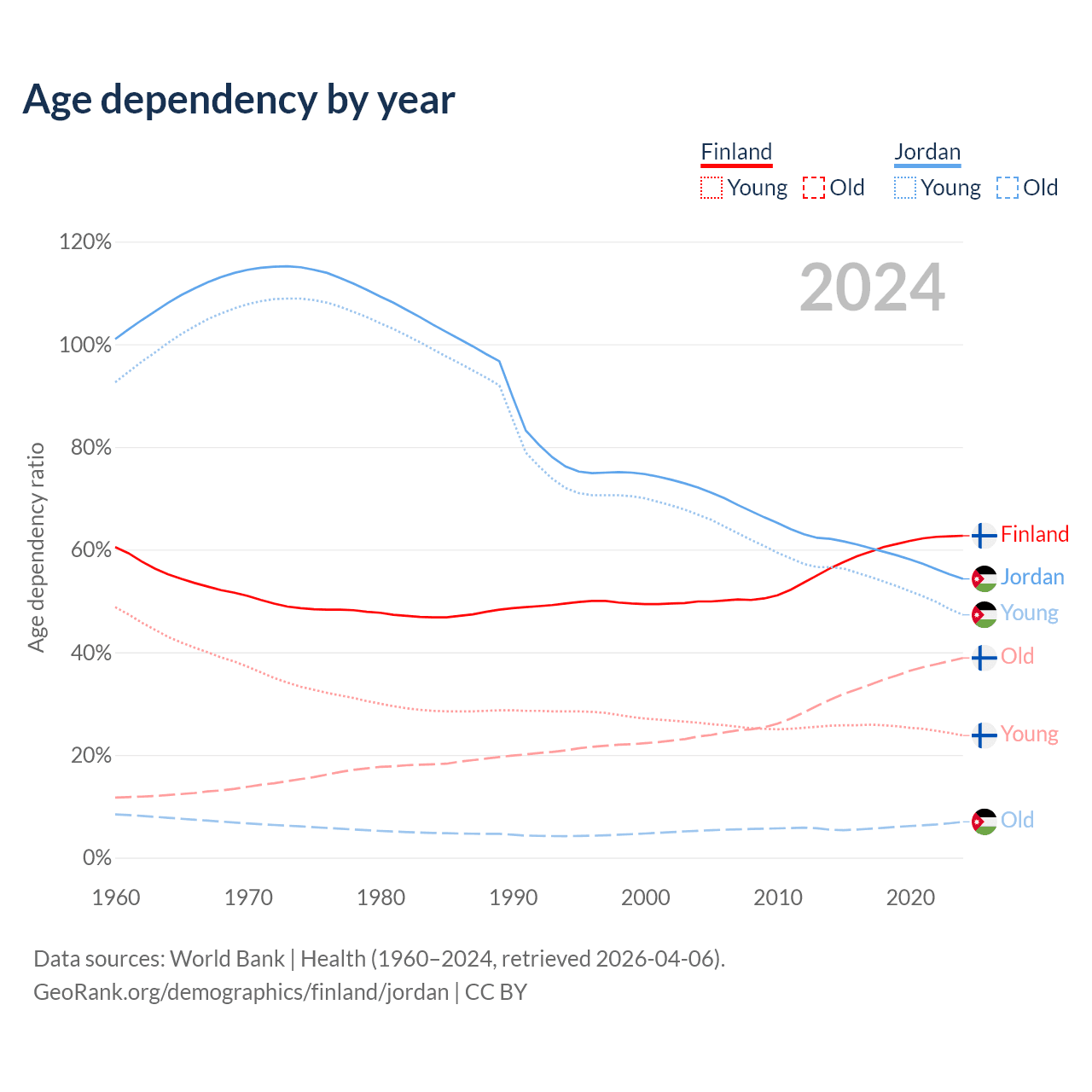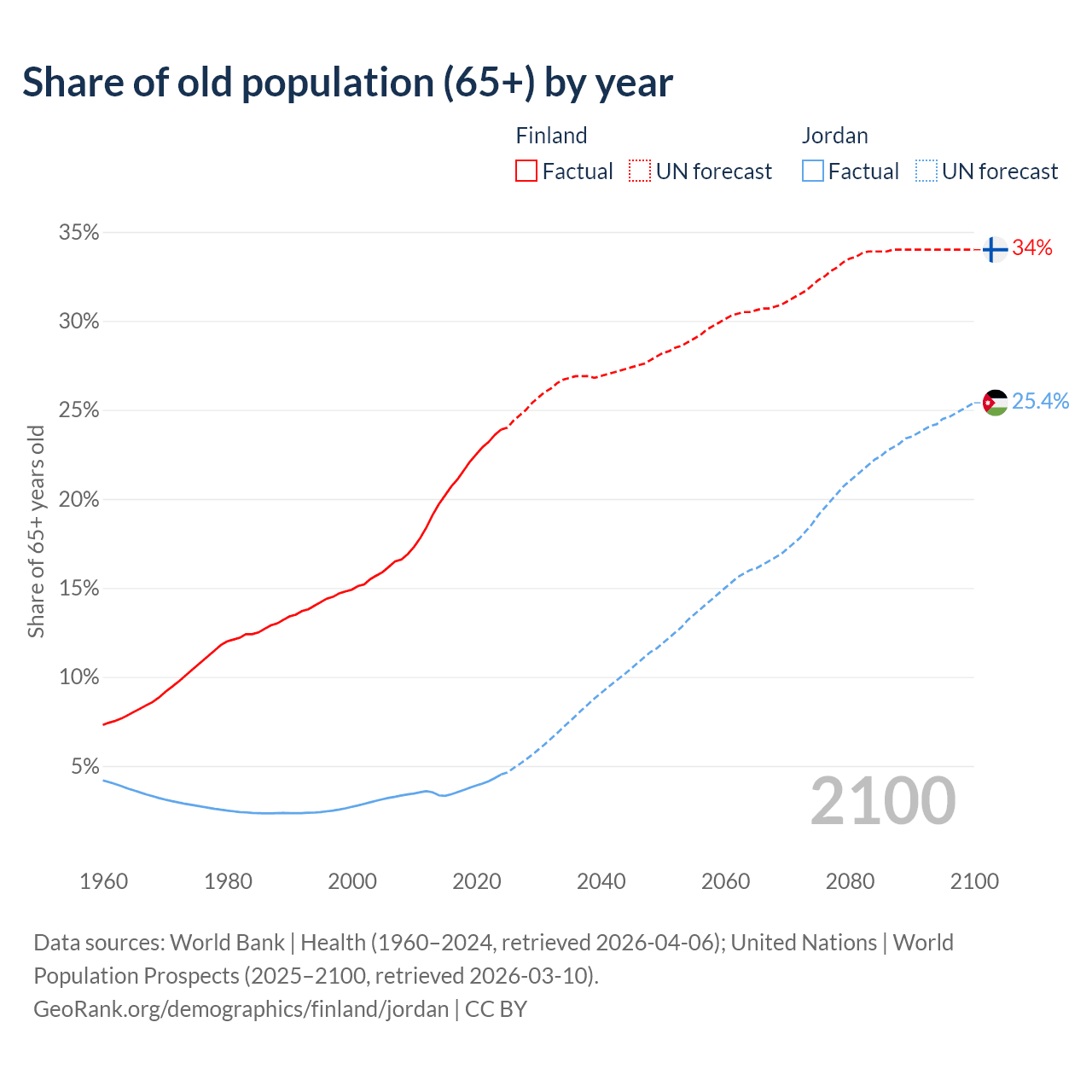 - The share of old-age demographic (65+) in Finland is 23.9% vs 4.52% in Jordan.