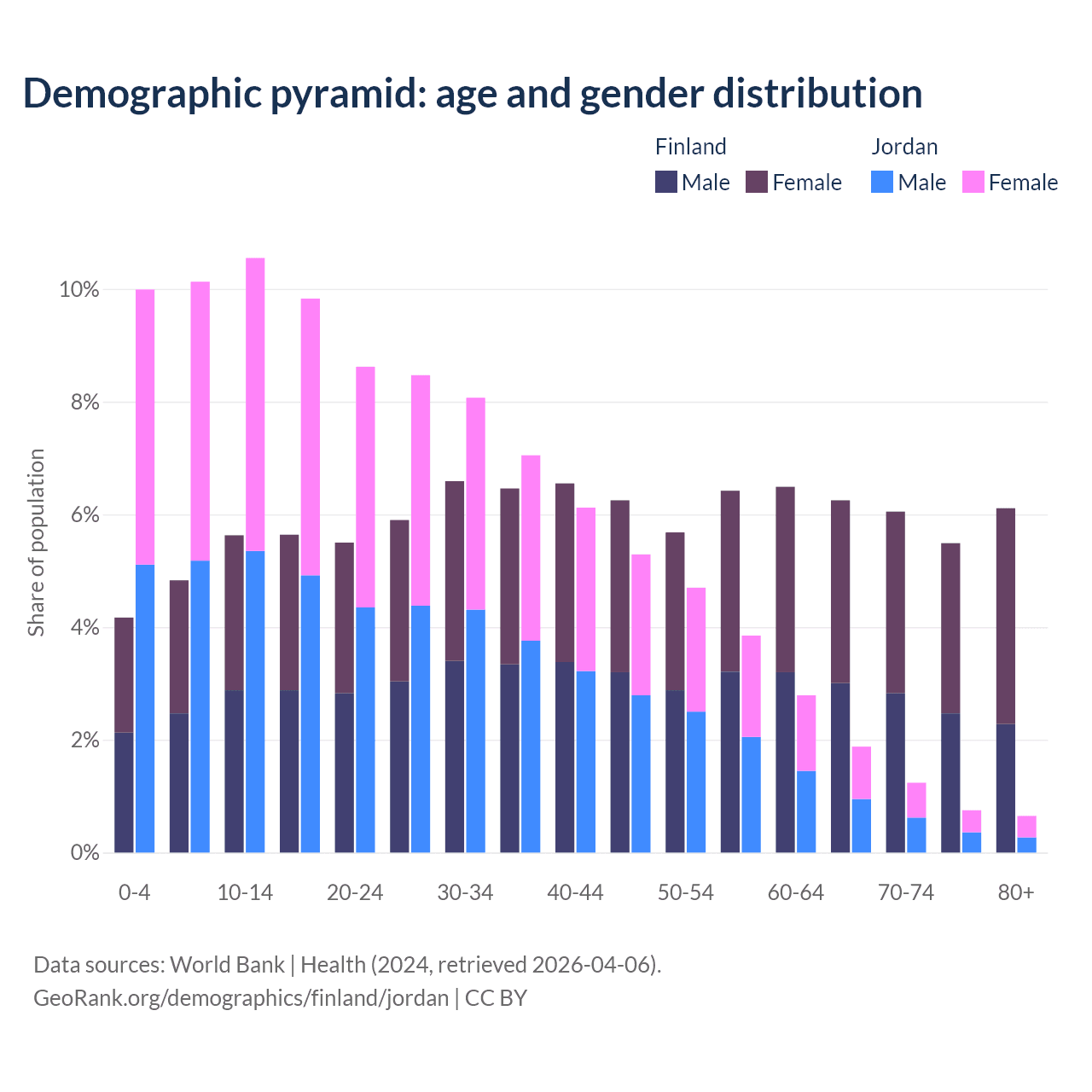 - Finland is ranked 22/196 by median age (oldest to youngest) vs 131/196 for Jordan.