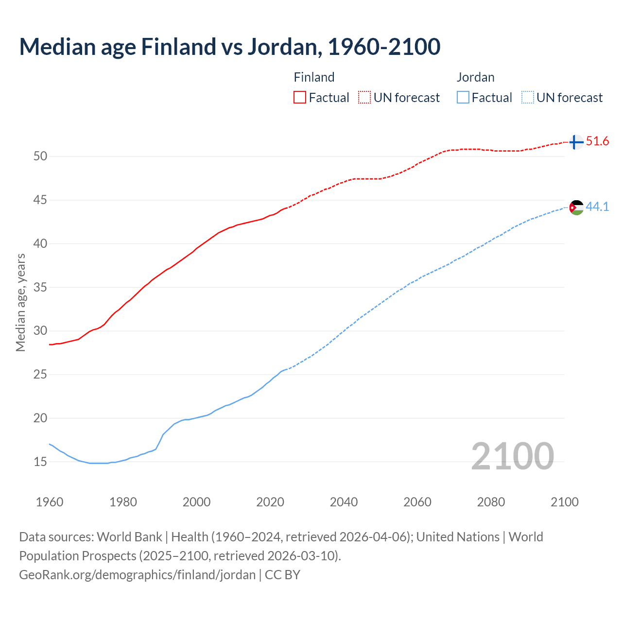 - The median age in Finland is 44 years compared to 25.5 years in Jordan.
