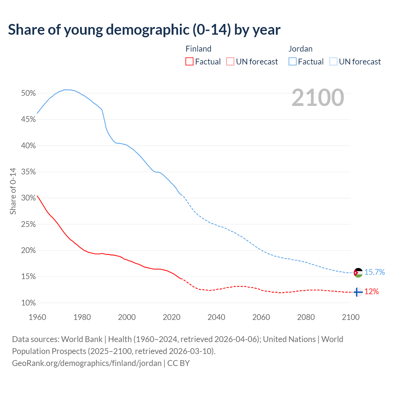 - The share of young demographic (0-15 years old) in Finland is 14.6% vs 30.7% in Jordan.