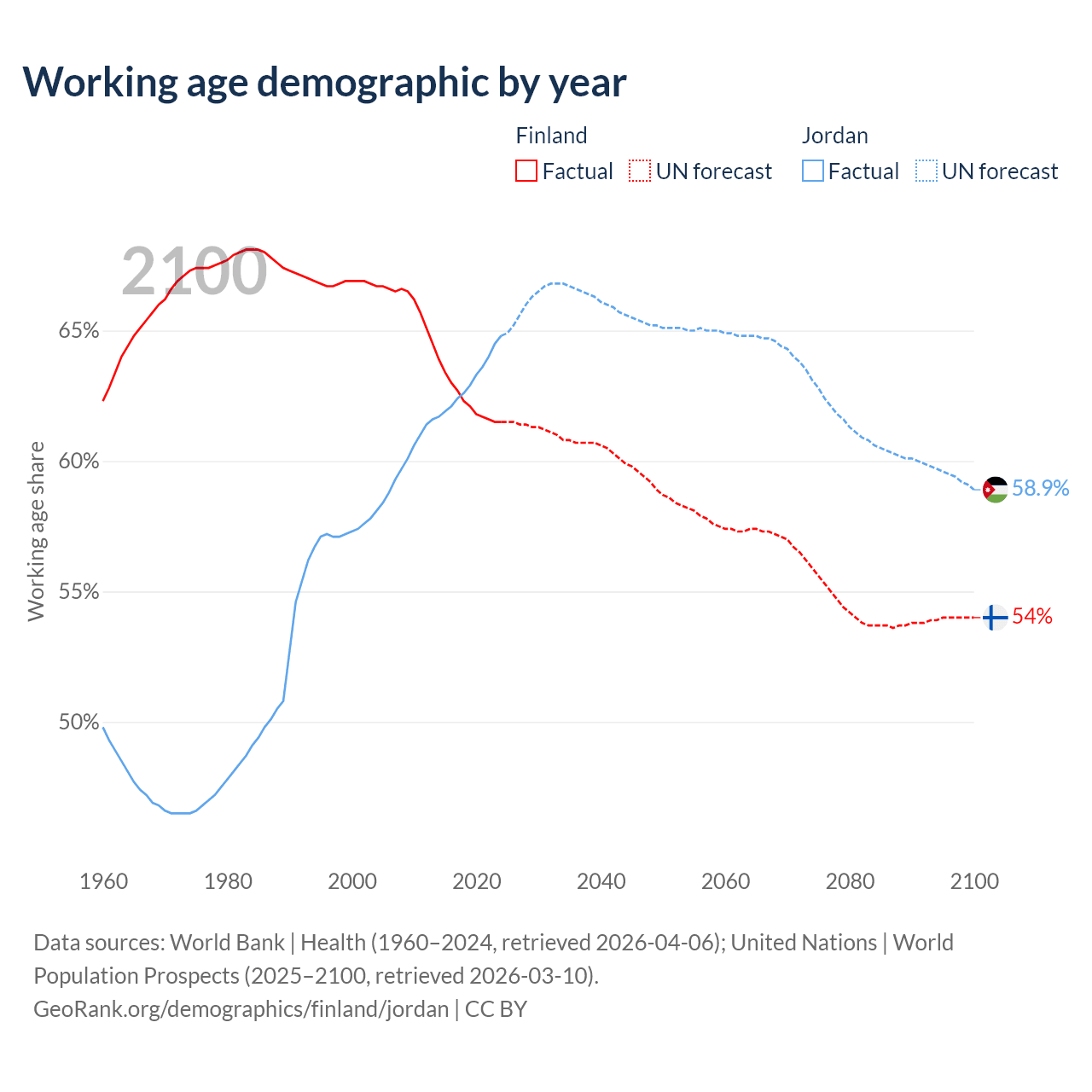 - Finland has 3.46M working age adults (aged 15-64) vs 7.49M in Jordan.