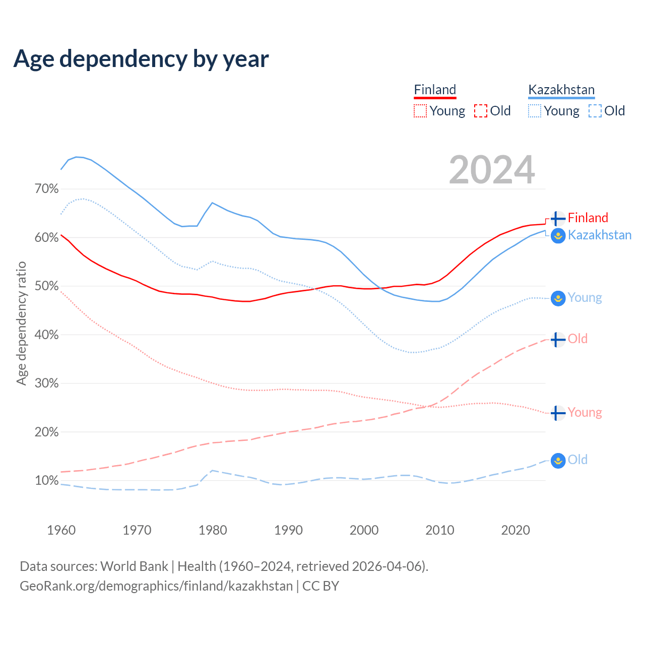 Data sources: World Bank | Health (1960–2024, retrieved 2026-04-06); U.S. Census Bureau (1960–2024, retrieved 2026-02-08).