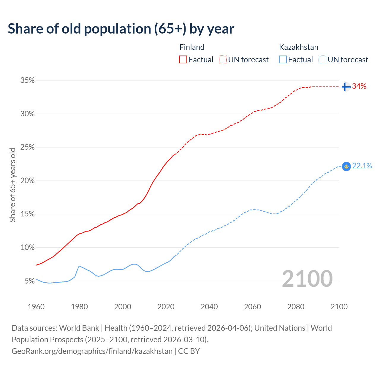 - The share of old-age demographic (65+) in Finland is 23.9% vs 8.65% in Kazakhstan.