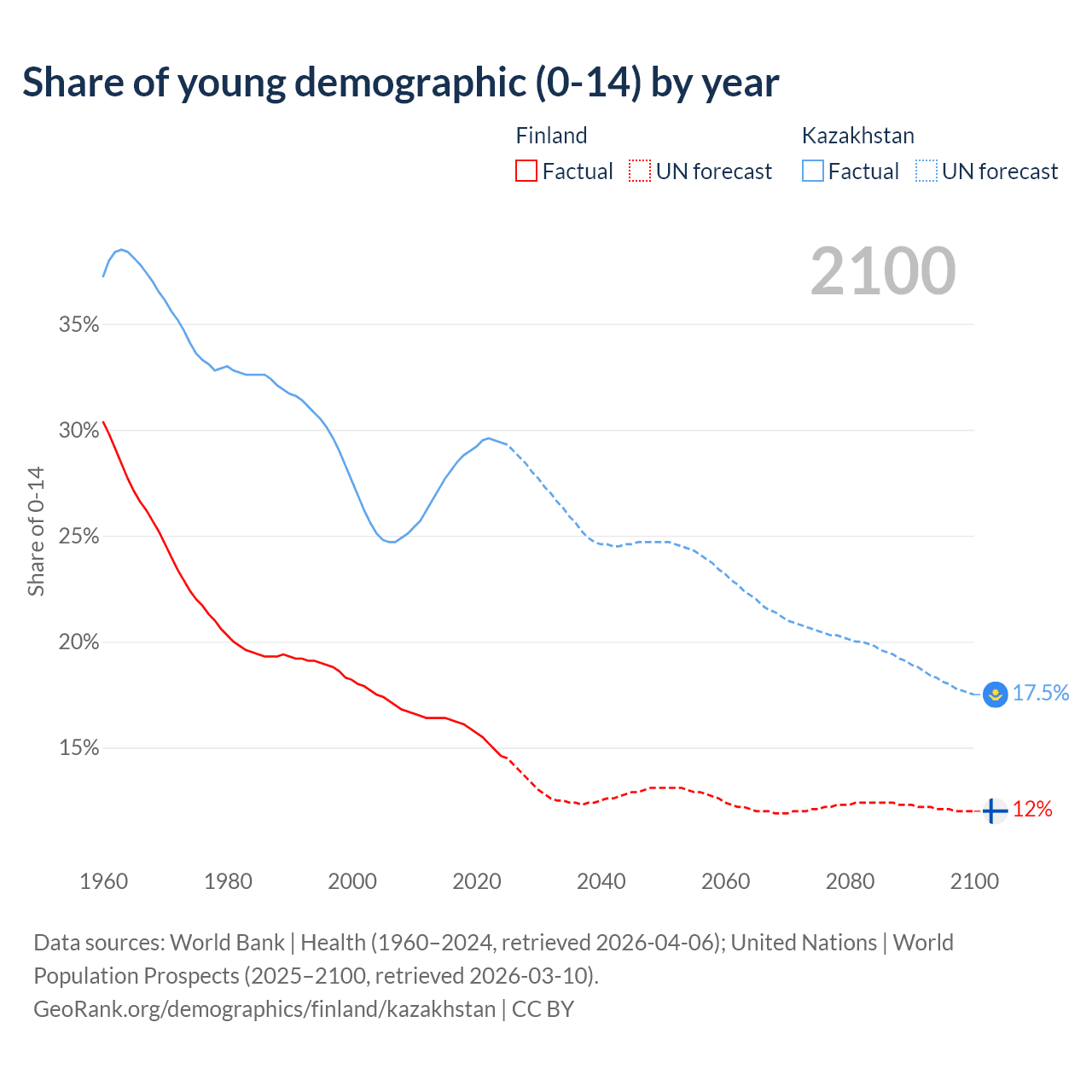 - The share of young demographic (0-15 years old) in Finland is 14.6% vs 29.4% in Kazakhstan.