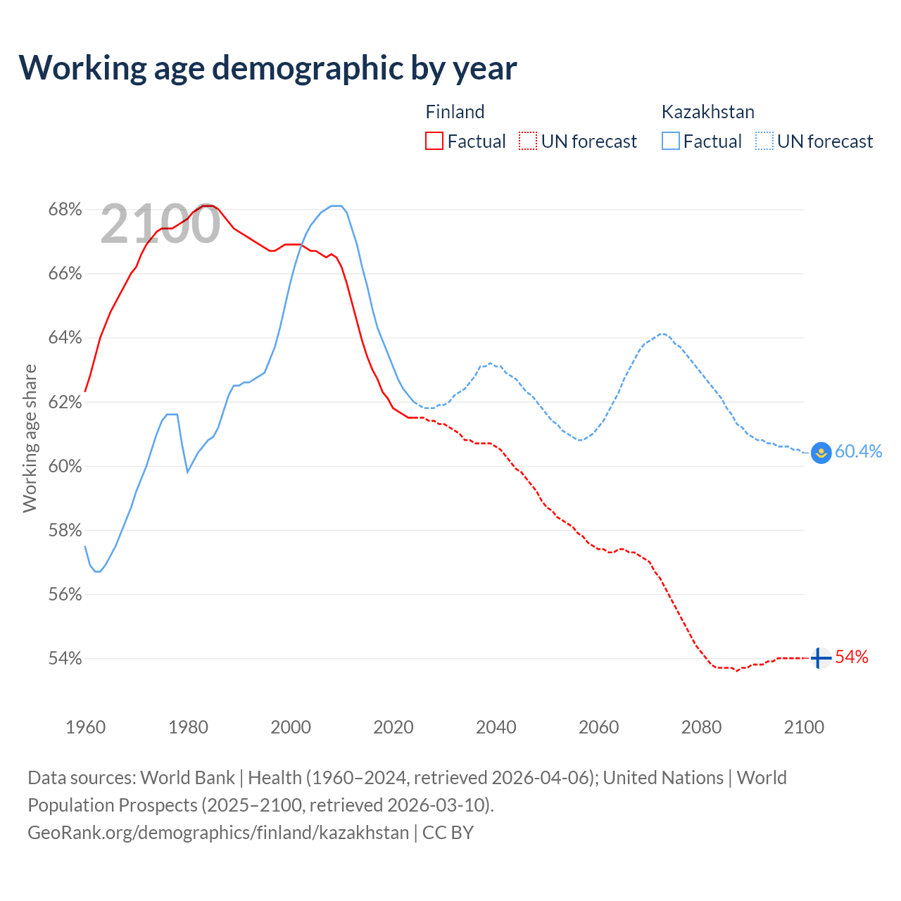 Median age Finland vs Kazakhstan, 1960-2100