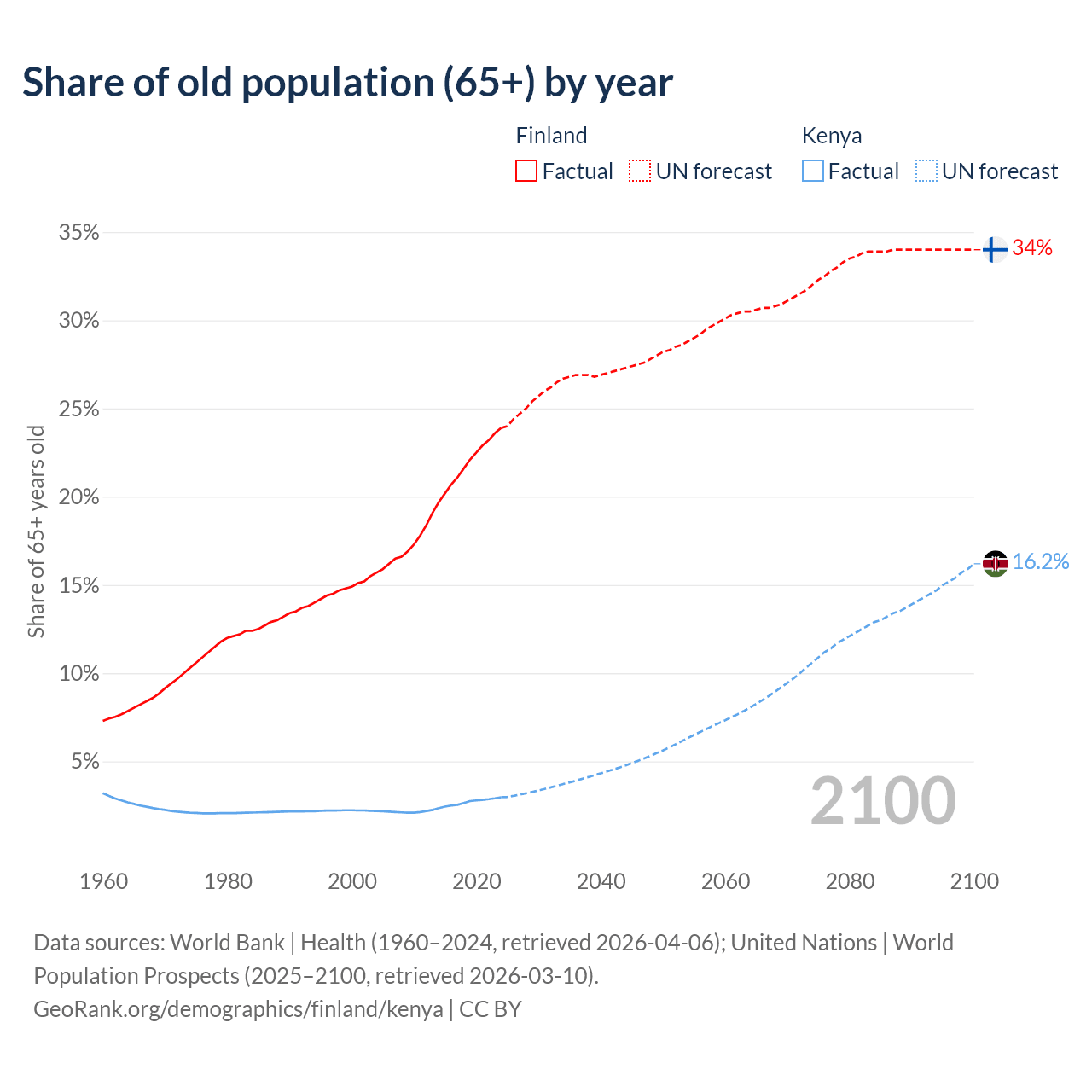 - The share of old-age demographic (65+) in Finland is 23.9% vs 2.97% in Kenya.