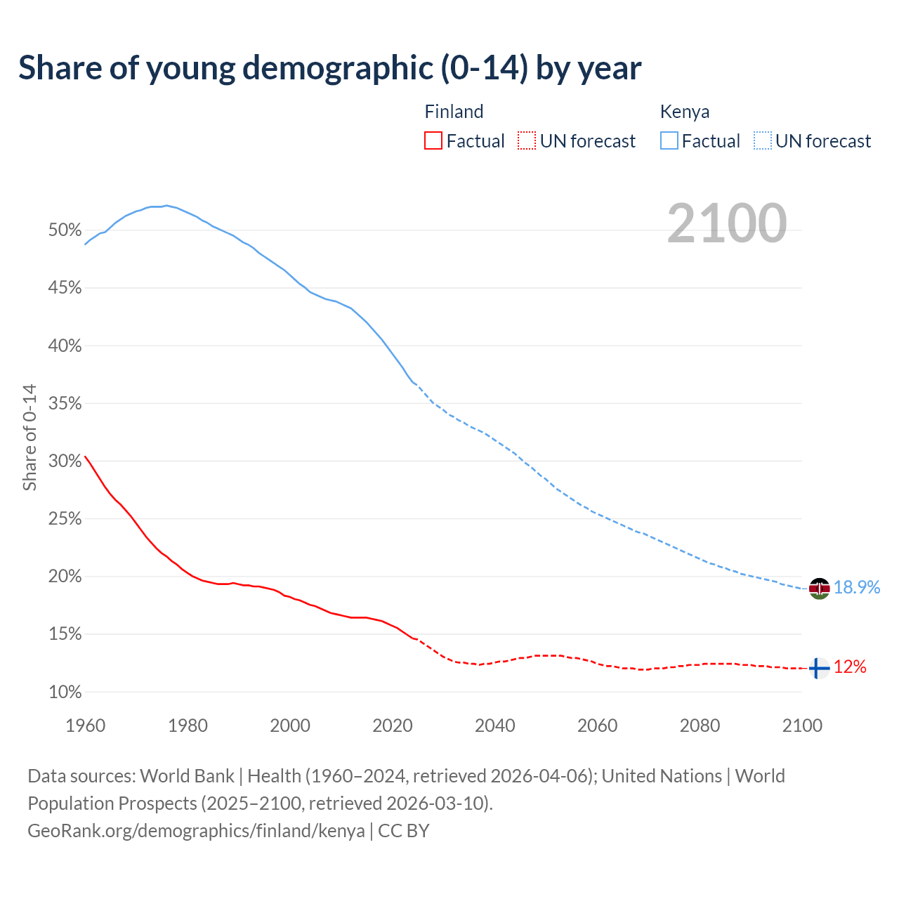 - The share of young demographic (0-15 years old) in Finland is 14.6% vs 36.8% in Kenya.