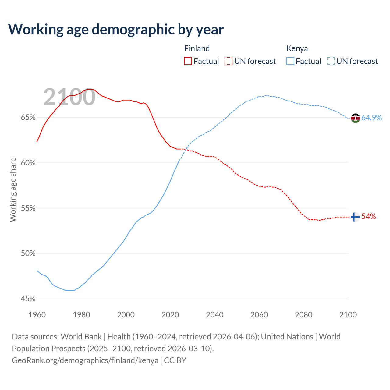 Median age Finland vs Kenya, 1960-2100