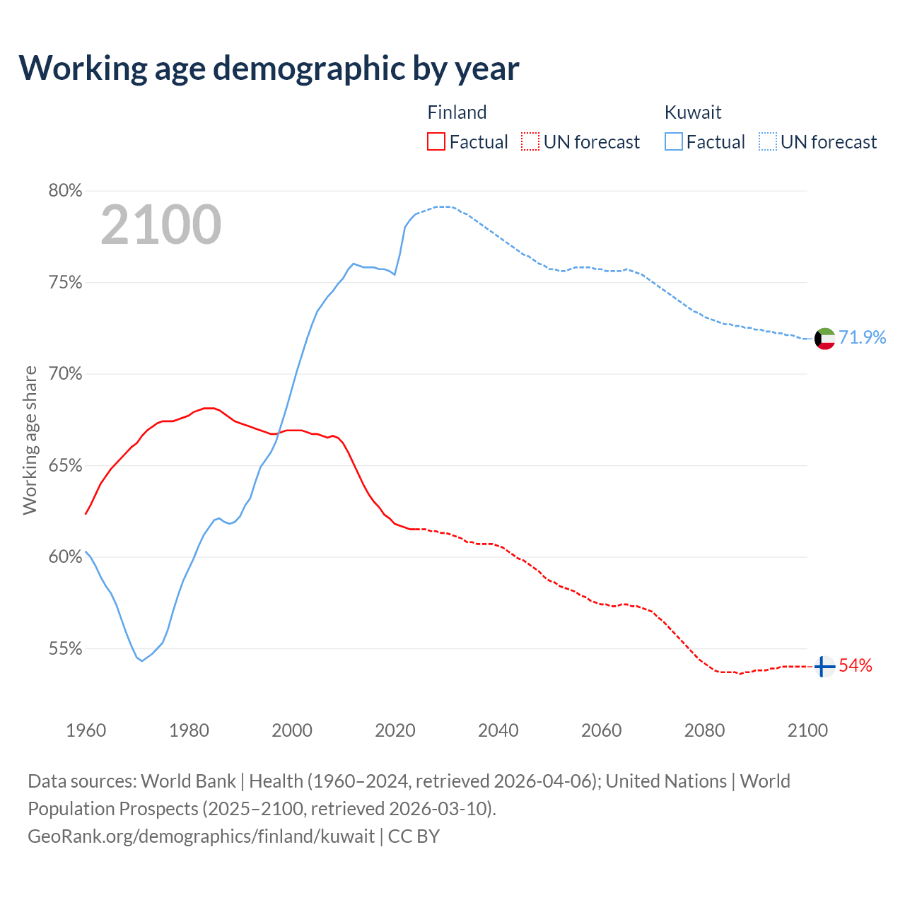 Median age Finland vs Kuwait, 1960-2100