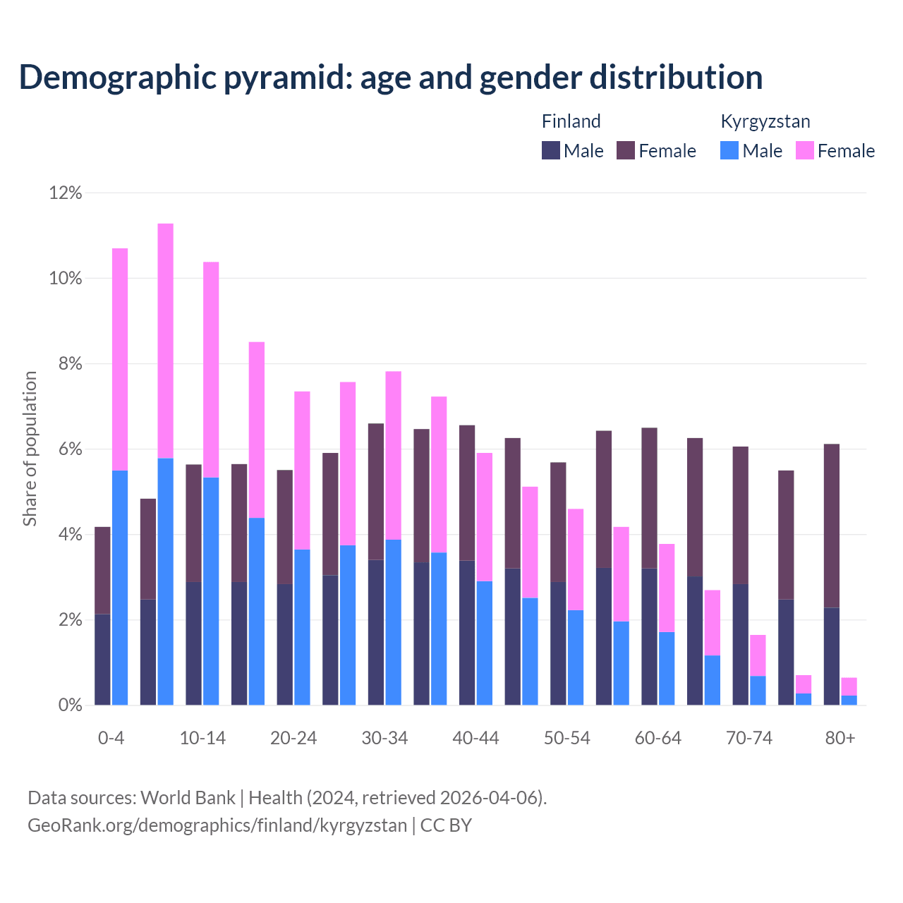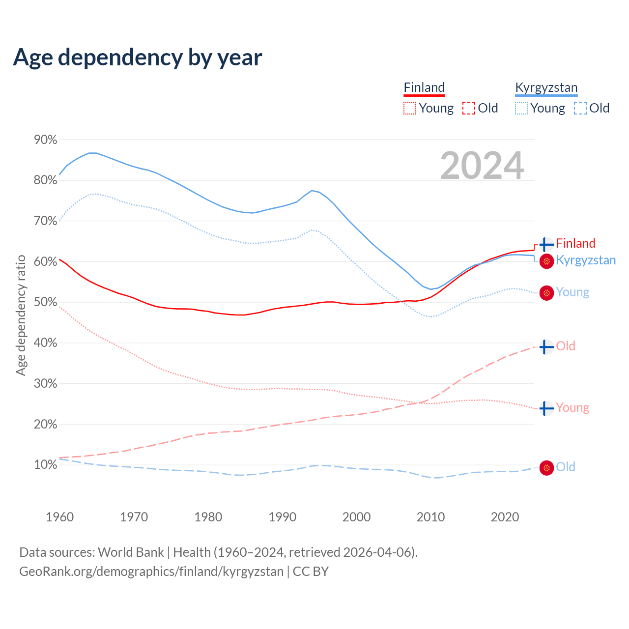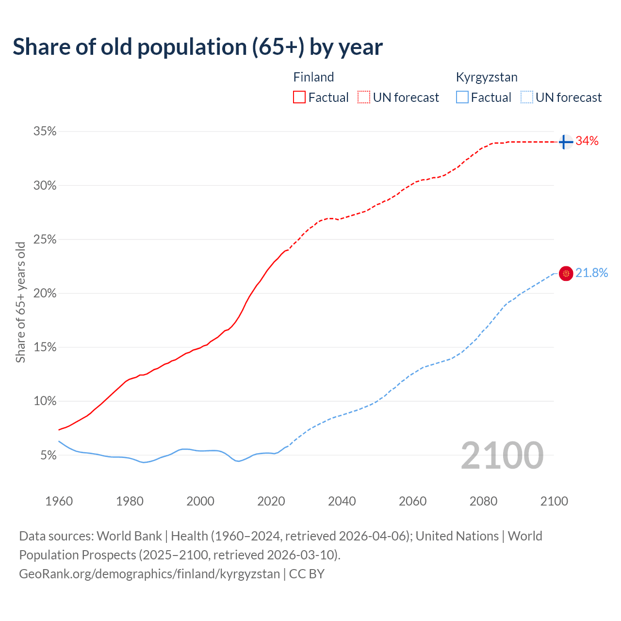 - The share of old-age demographic (65+) in Finland is 23.9% vs 5.68% in Kyrgyzstan.