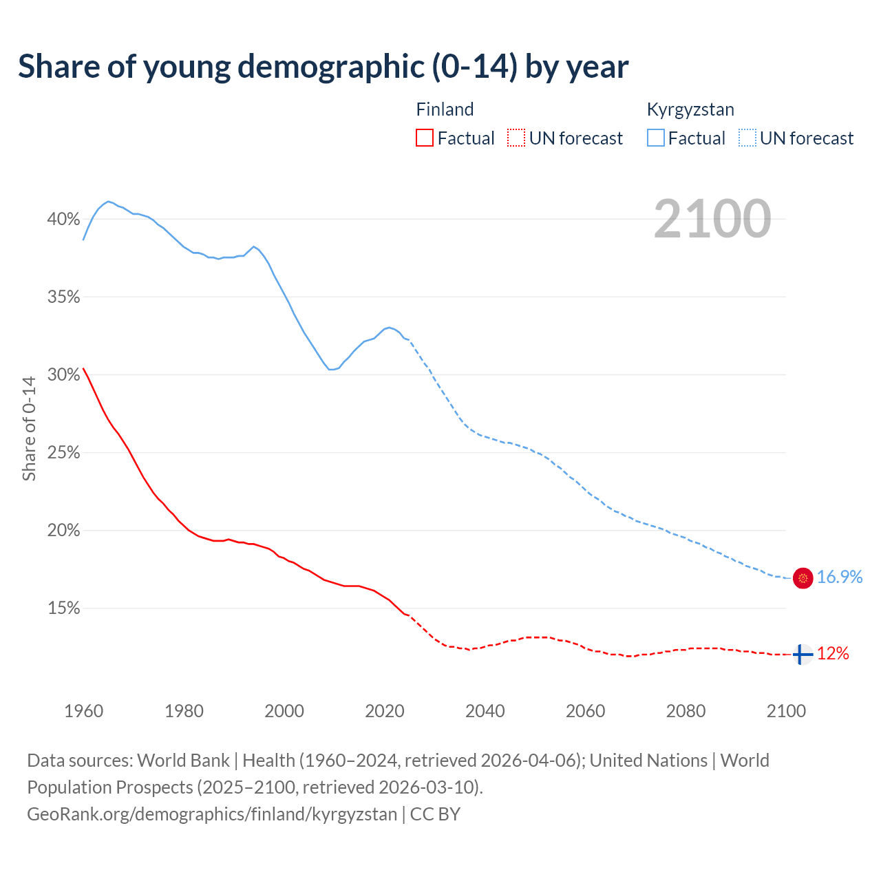 - The share of young demographic (0-15 years old) in Finland is 14.6% vs 32.3% in Kyrgyzstan.