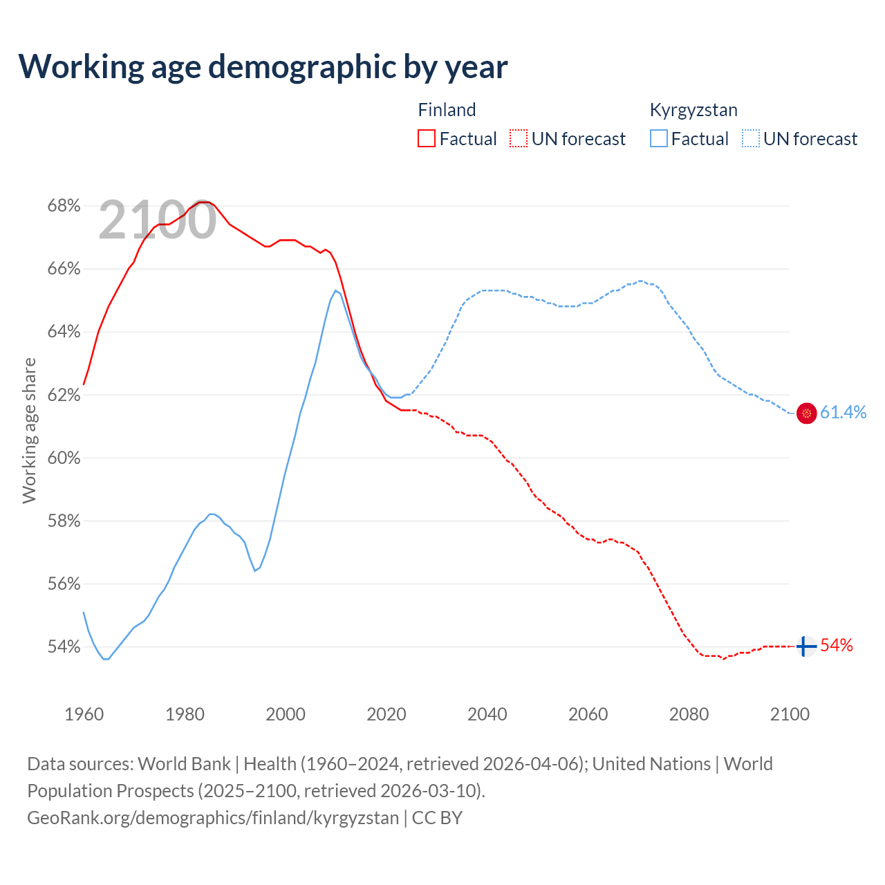 - Finland has 3.46M working age adults (aged 15-64) vs 4.63M in Kyrgyzstan.