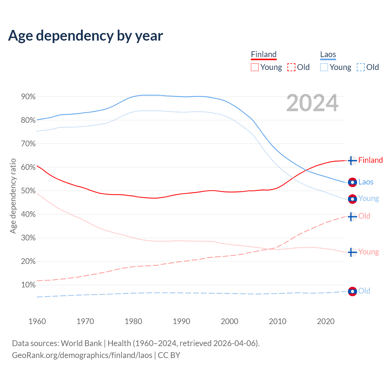 - The share of old-age demographic (65+) in Finland is 23.9% vs 4.67% in Laos.