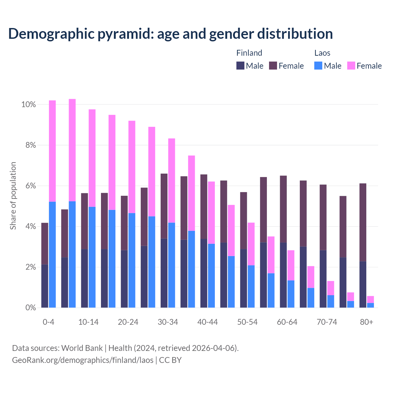 - As of 2026, the population of Finland is 5.63M vs 8M in Laos - 1.42 times difference.