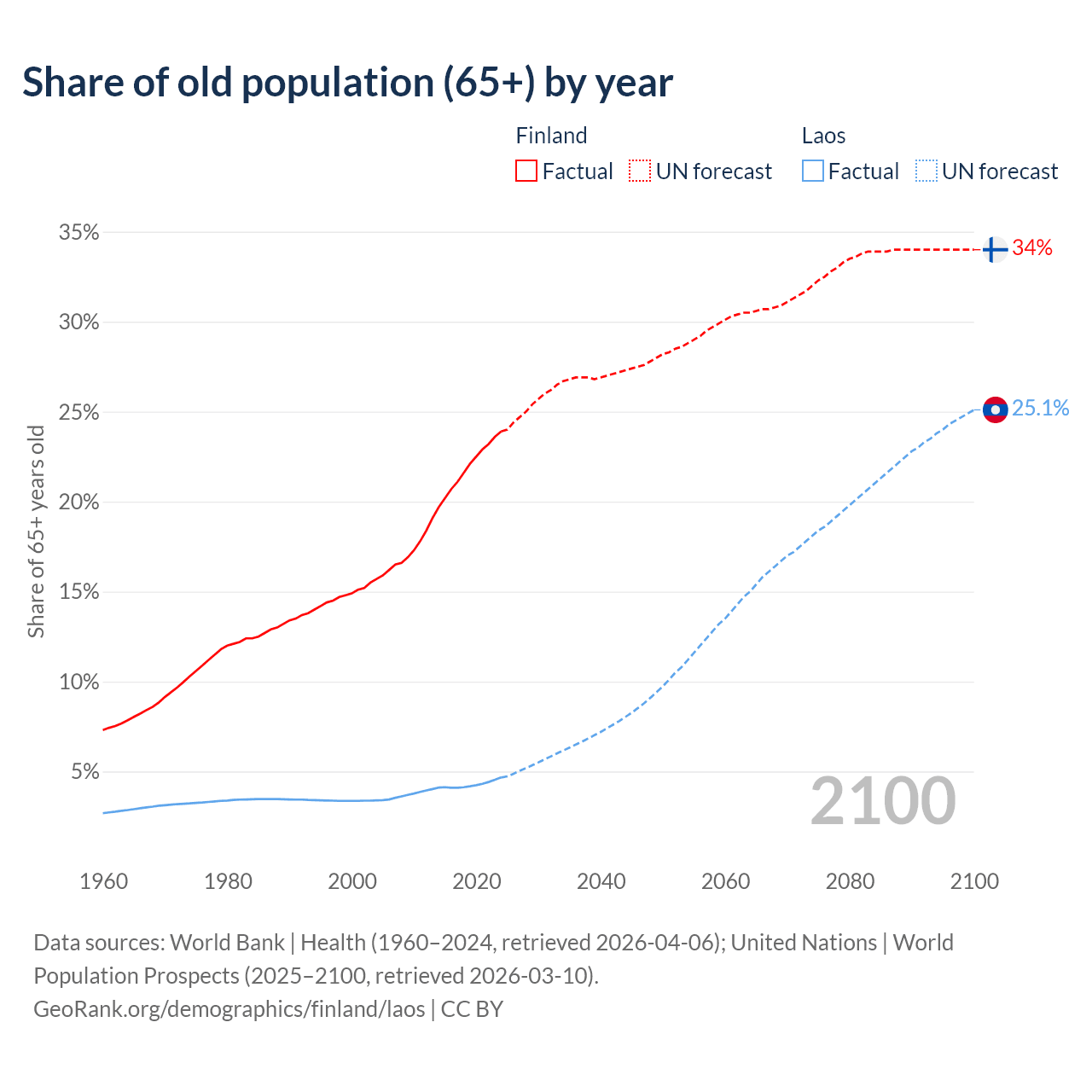 The share of older people aged 65 and over is 23.9% in Finland and 4.67% in Laos. Life expectancy in Finland compared to Laos .