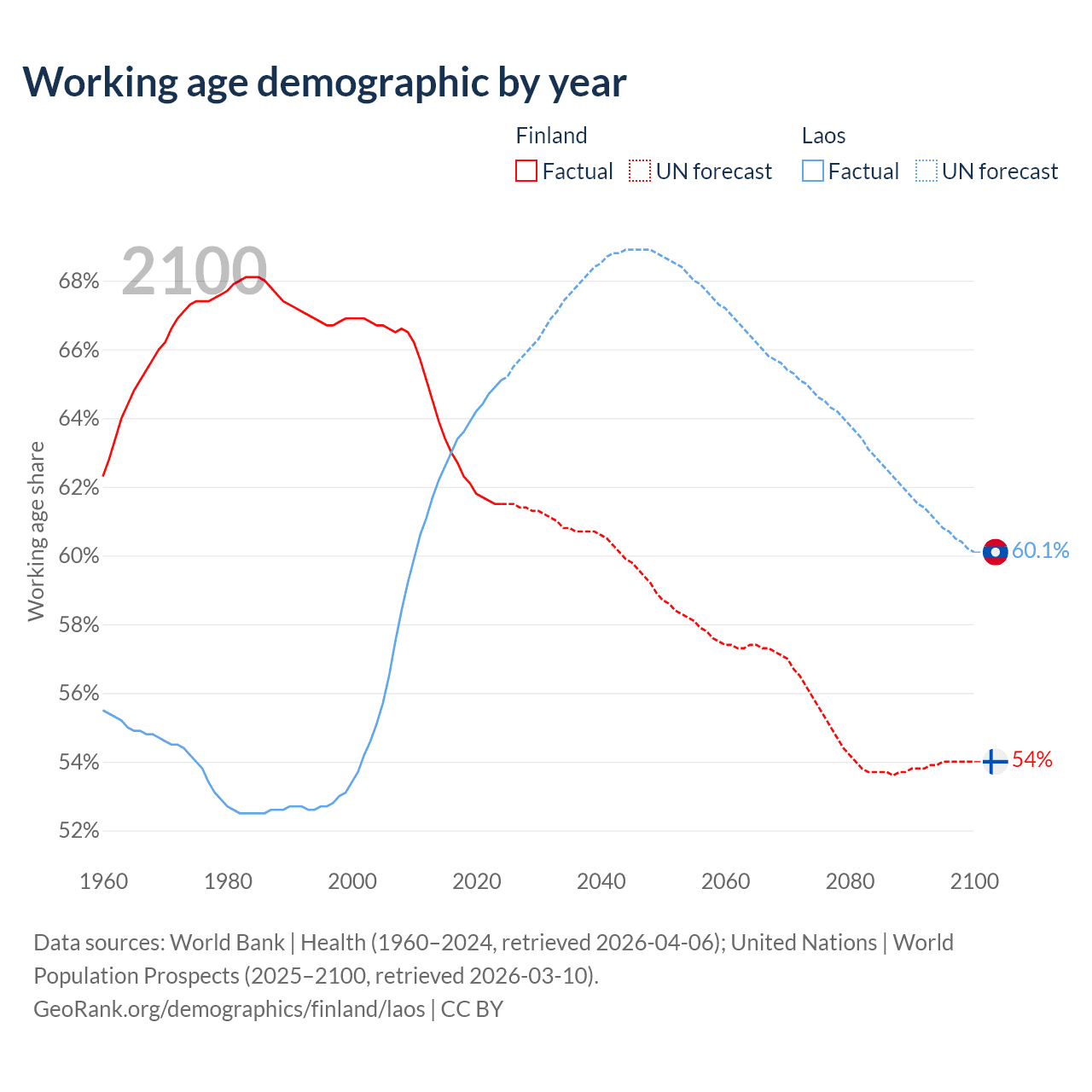 - Finland has 3.46M working age adults (aged 15-64) vs 5.21M in Laos.