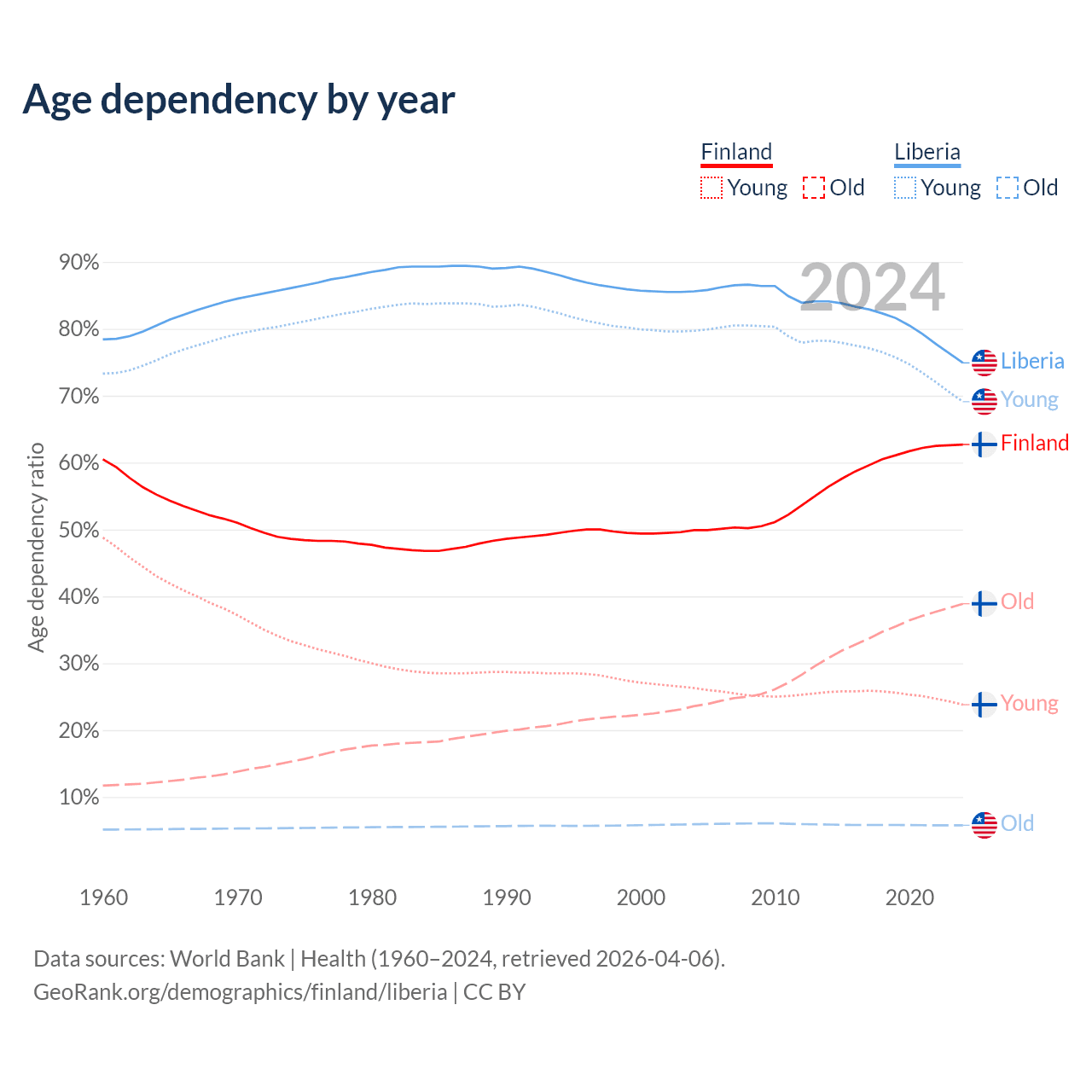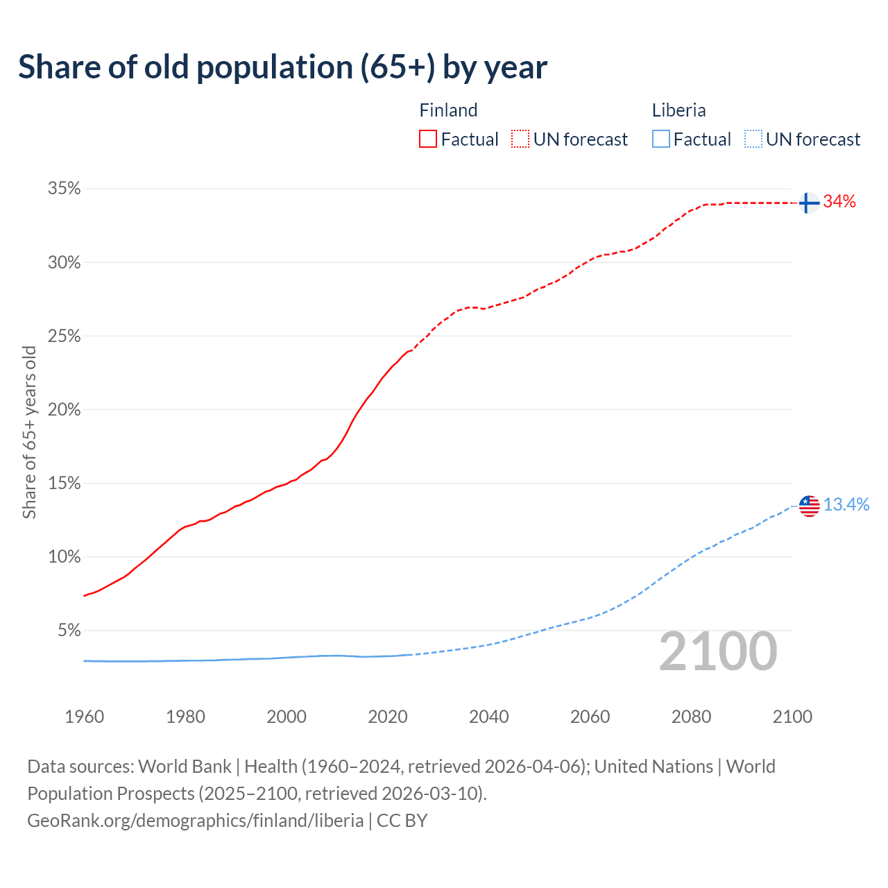 The share of older people aged 65 and over is 23.9% in Finland and 3.3% in Liberia. Life expectancy in Finland compared to Liberia .