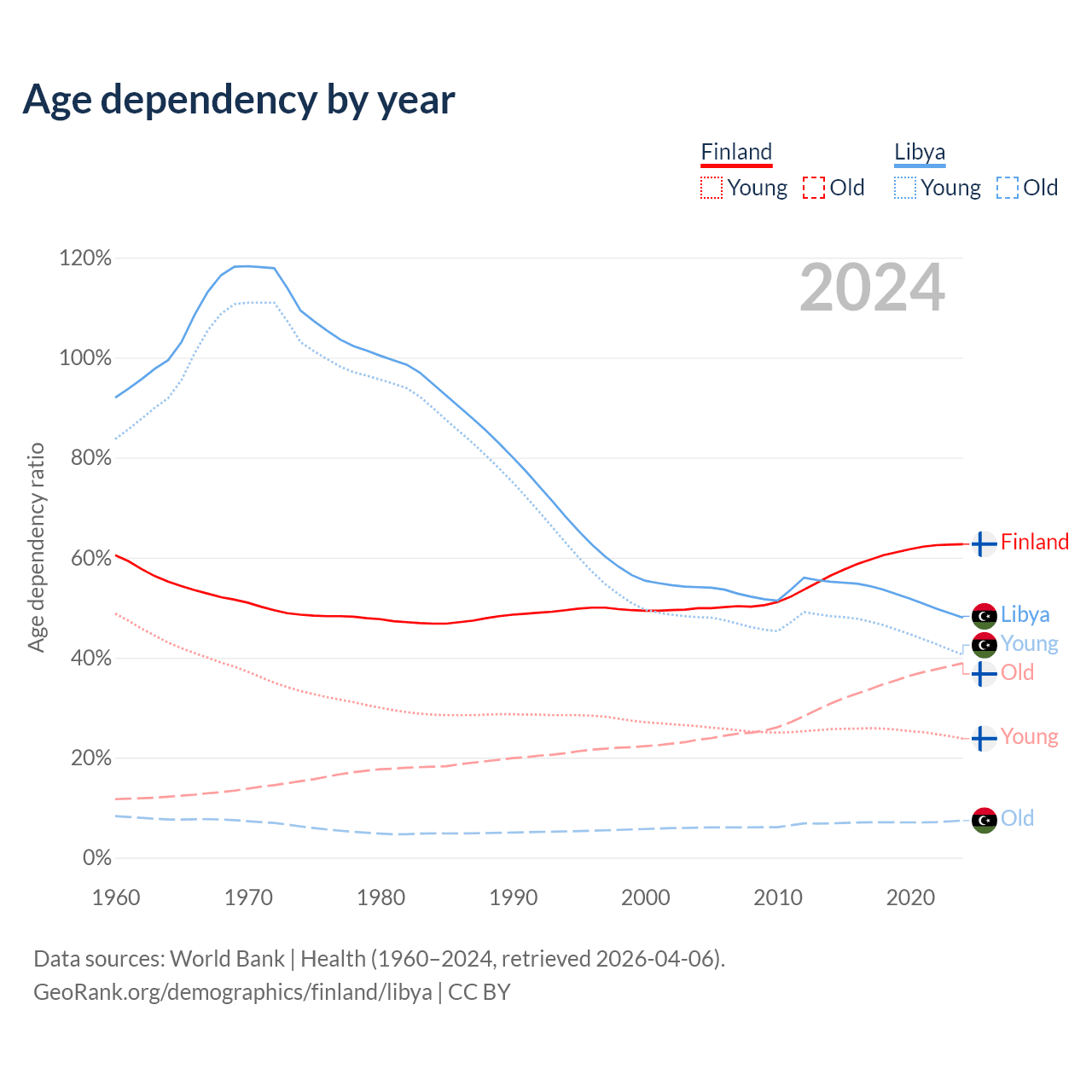 The share of older people aged 65 and over is 23.9% in Finland and 5.02% in Libya. Life expectancy in Finland compared to Libya .