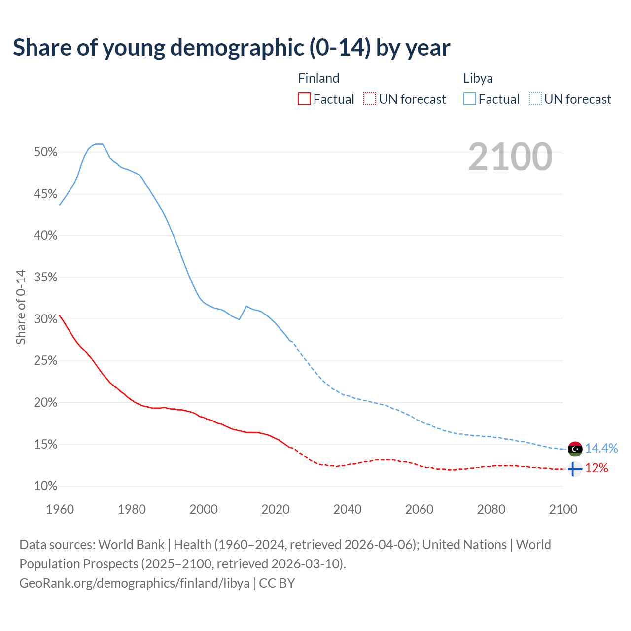 - The share of young demographic (0-15 years old) in Finland is 14.6% vs 27.4% in Libya.