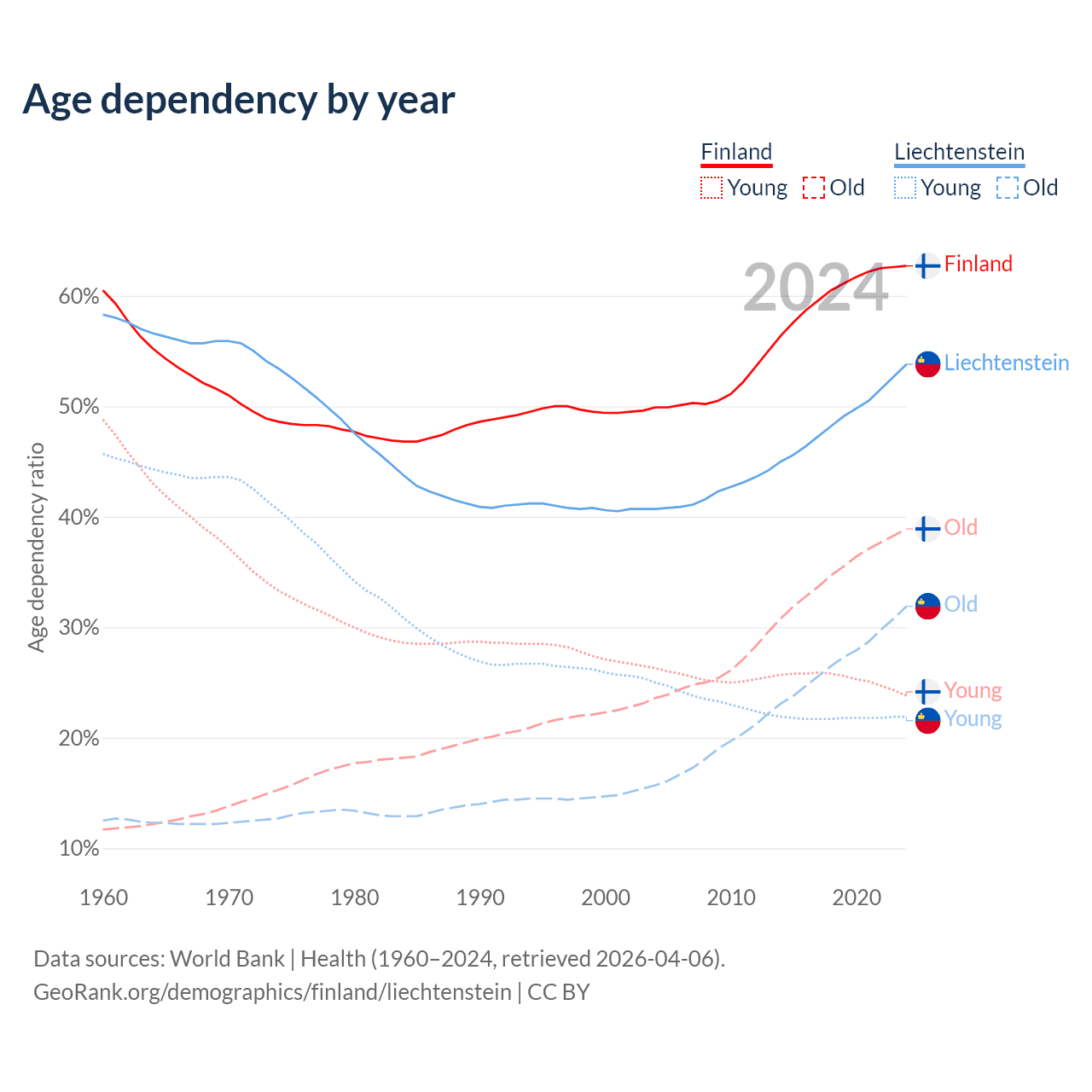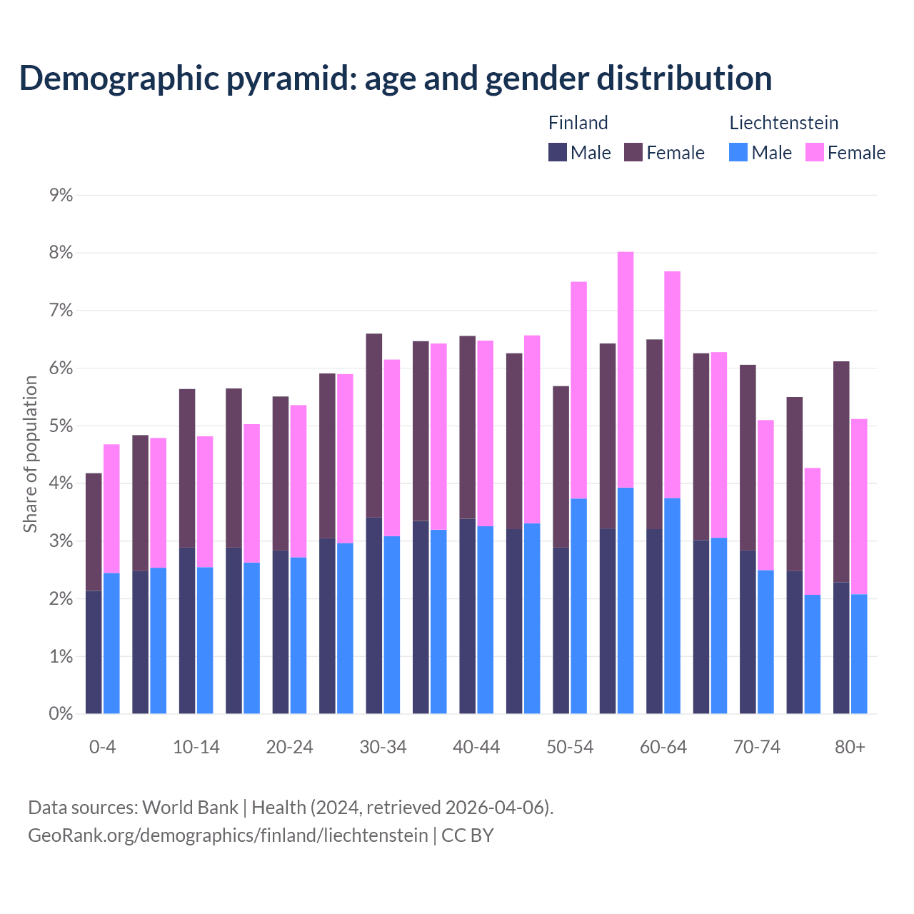 - The share of old-age demographic (65+) in Finland is 23.9% vs 20.7% in Liechtenstein.