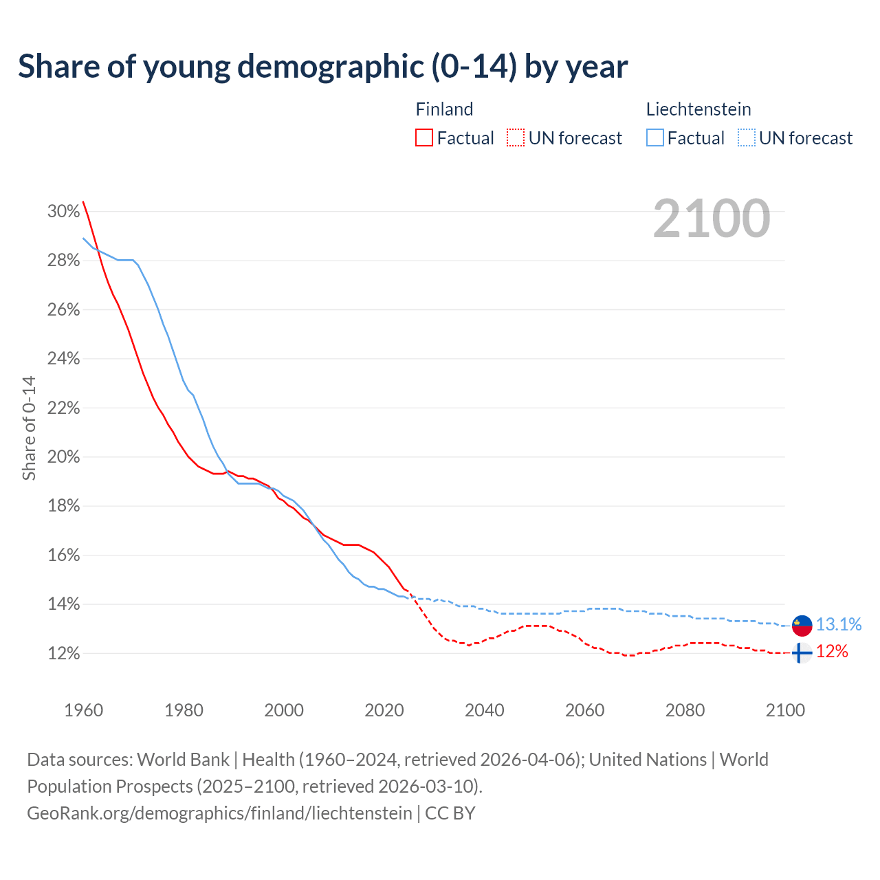 - The share of young demographic (0-15 years old) in Finland is 14.6% vs 14.3% in Liechtenstein.
