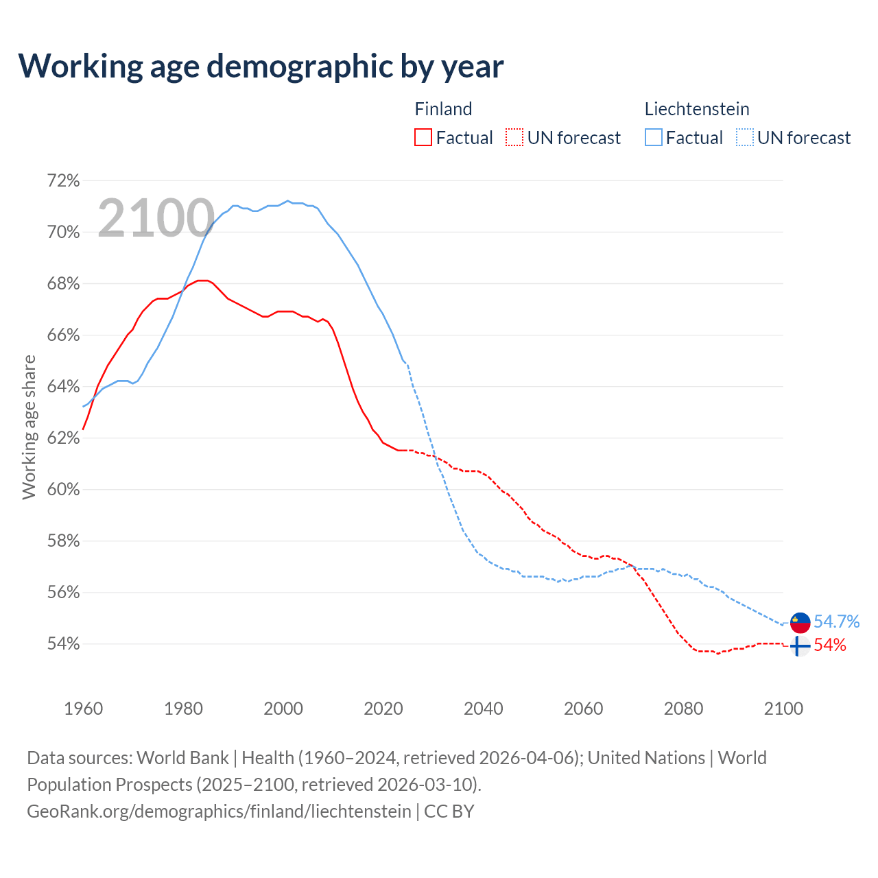 Median age Finland vs Liechtenstein, 1960-2100