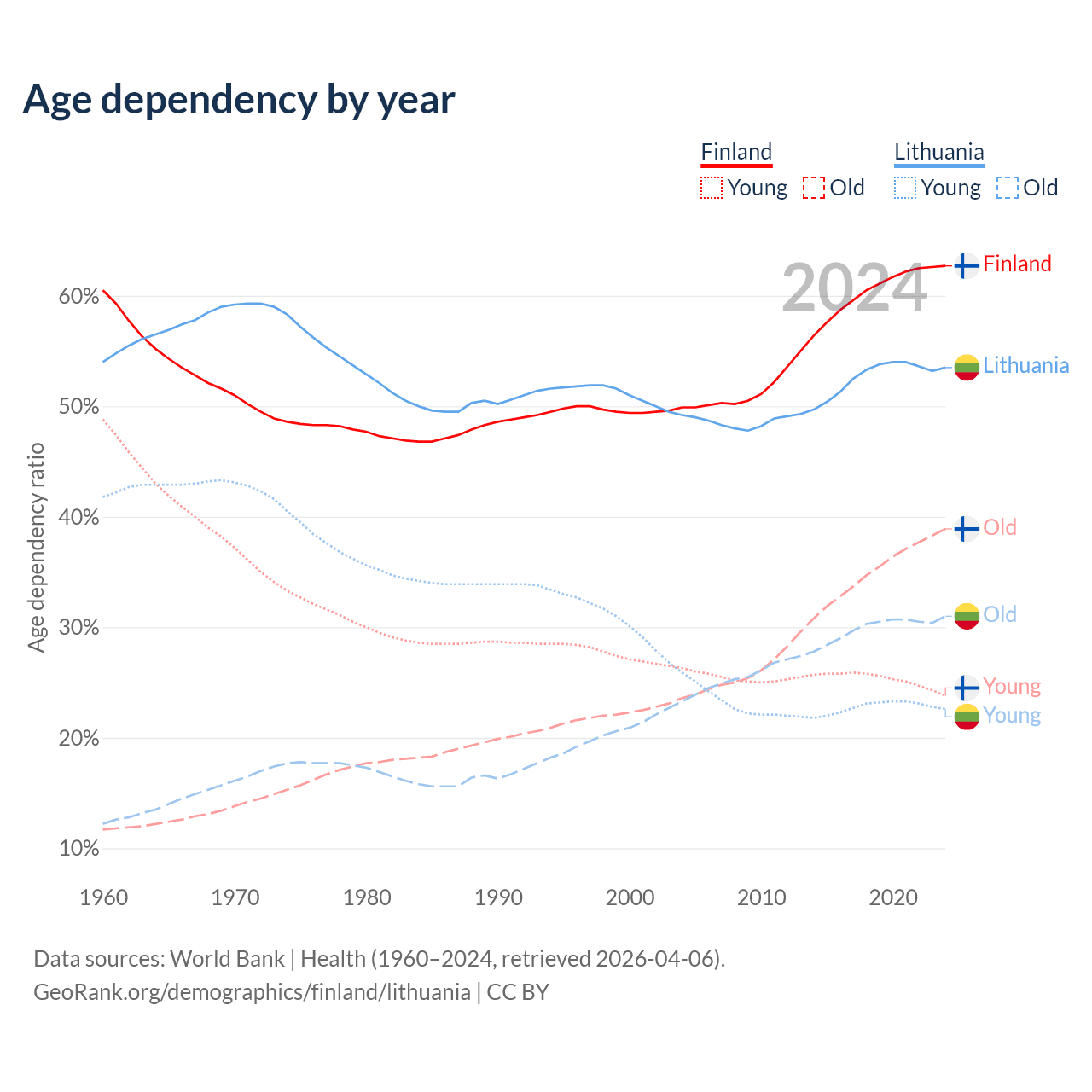 - Finland is ranked 22/196 by median age (oldest to youngest) vs 28/196 for Lithuania.