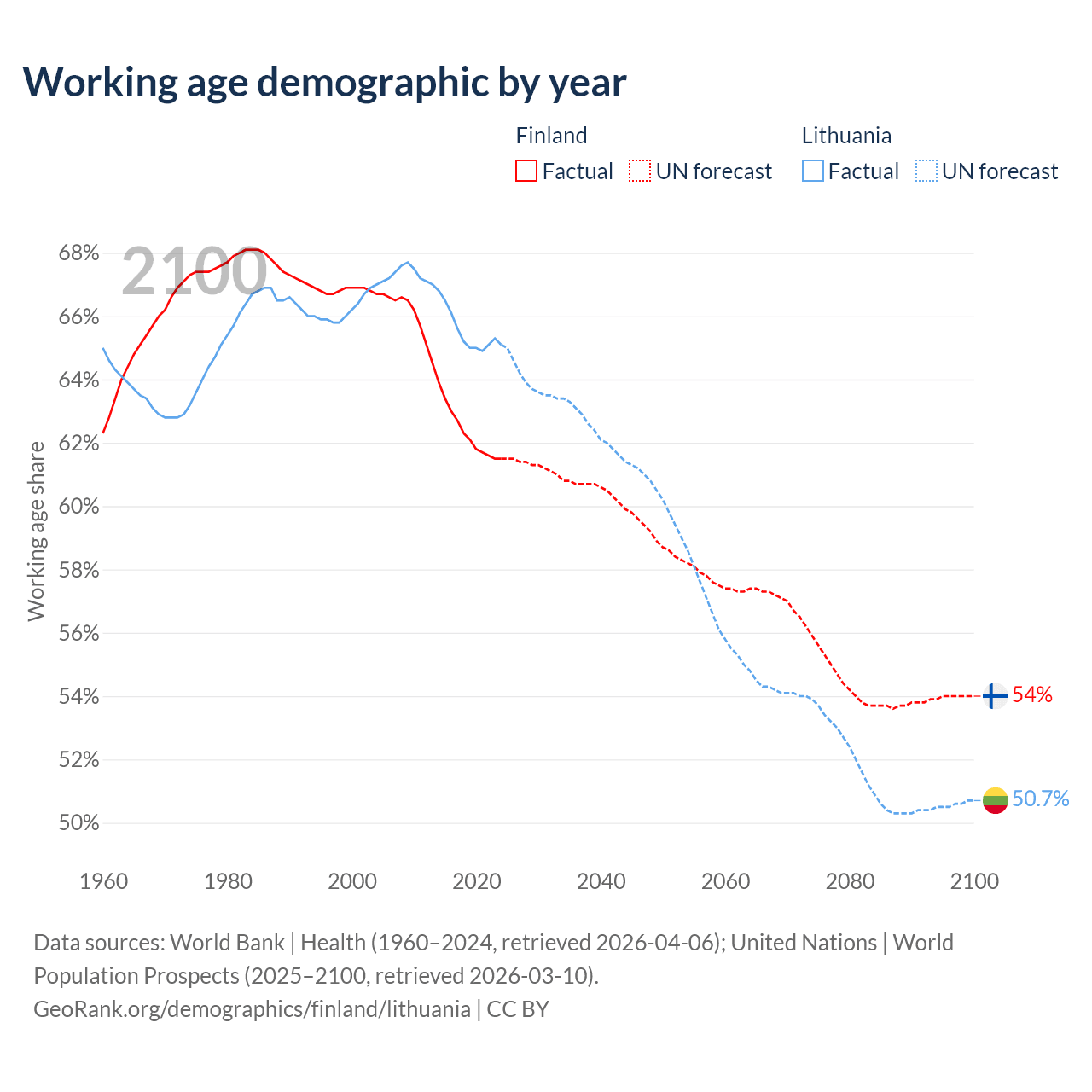 Median age Finland vs Lithuania, 1960-2100