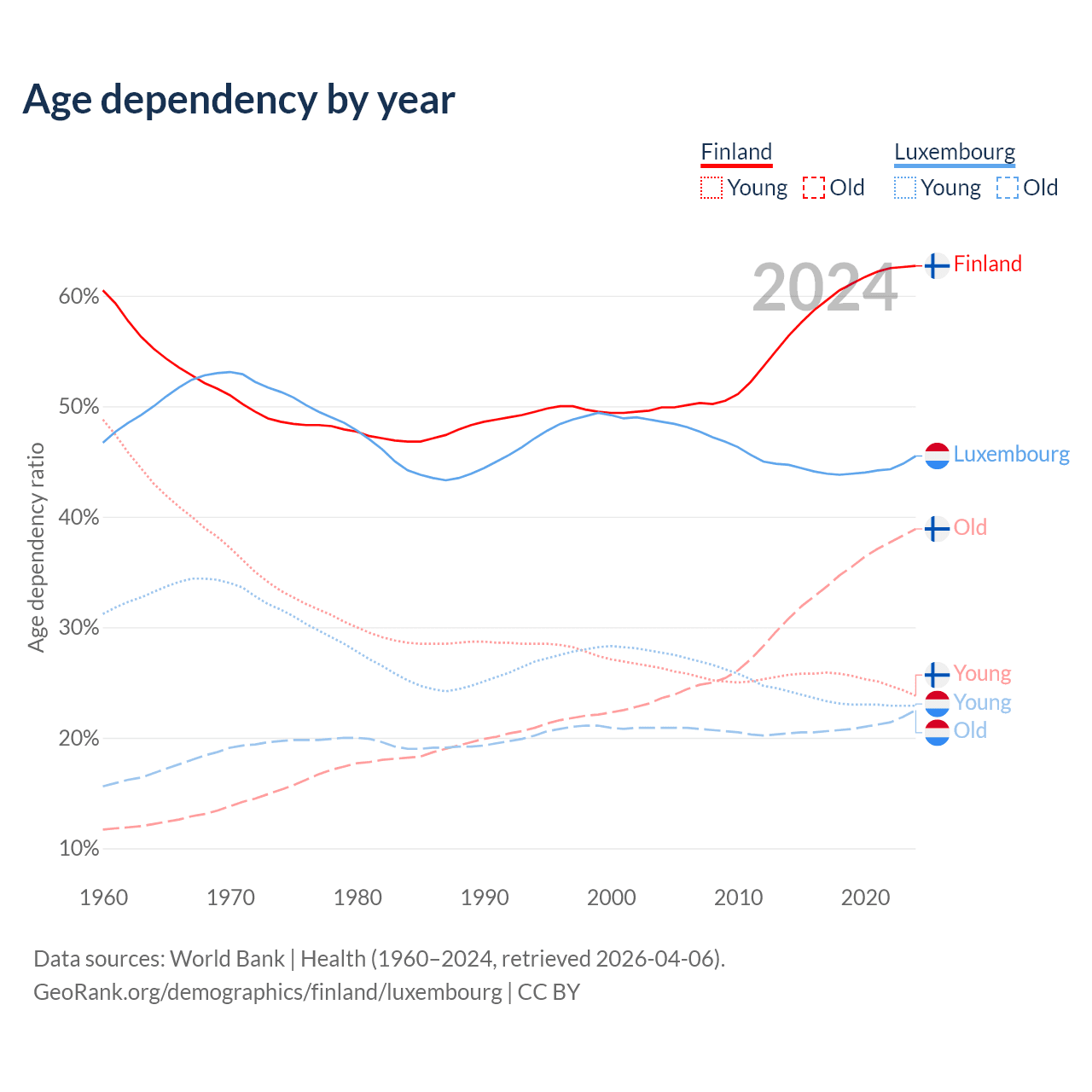 - The share of young demographic (0-15 years old) in Finland is 14.6% vs 15.8% in Luxembourg.
