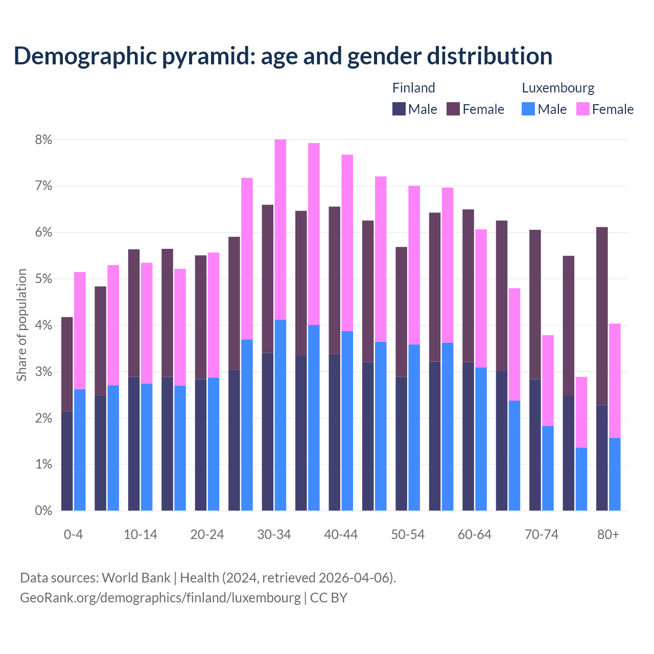- Finland is ranked 22/196 by median age (oldest to youngest) vs 46/196 for Luxembourg.