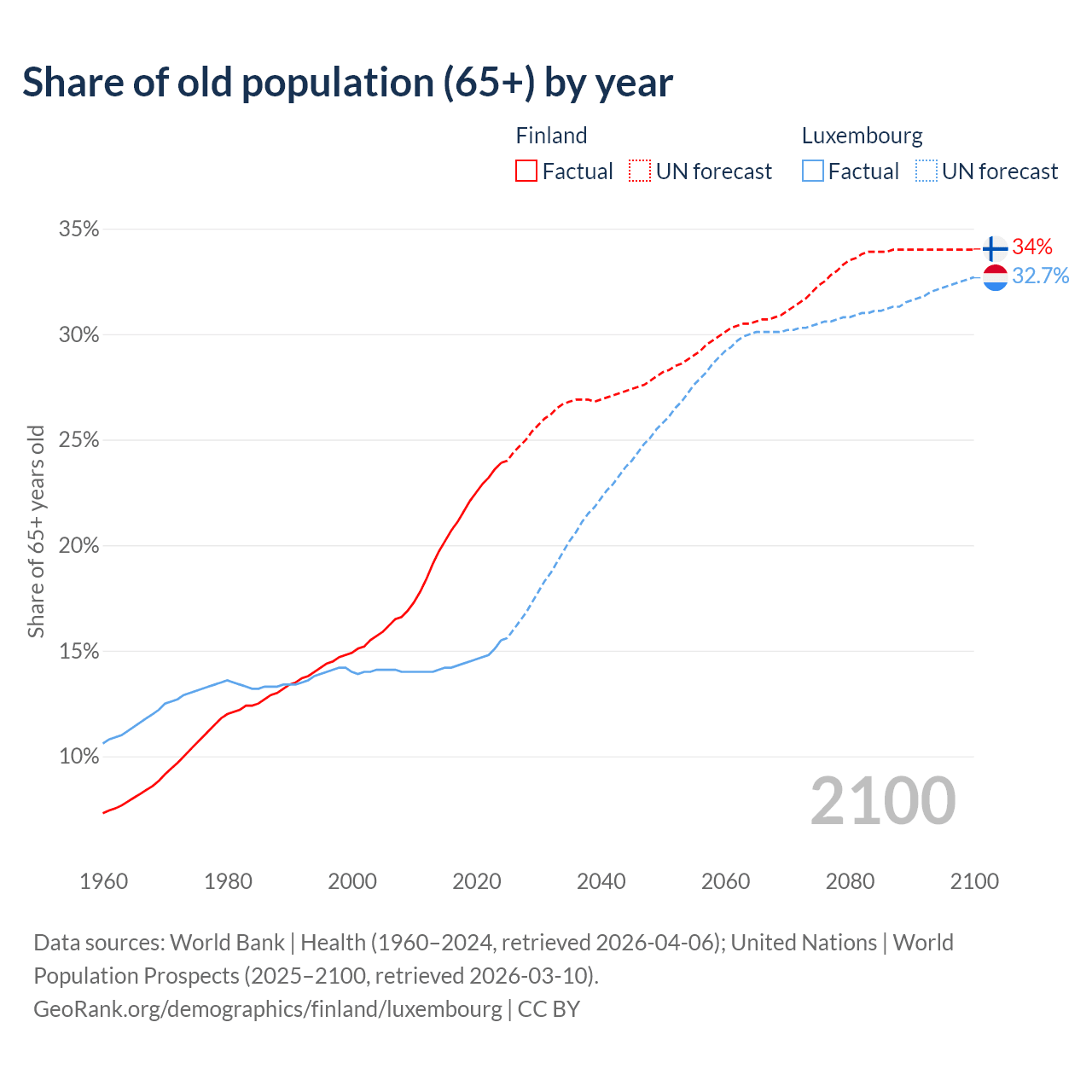 The share of older people aged 65 and over is 23.9% in Finland and 15.5% in Luxembourg. Life expectancy in Finland compared to Luxembourg .