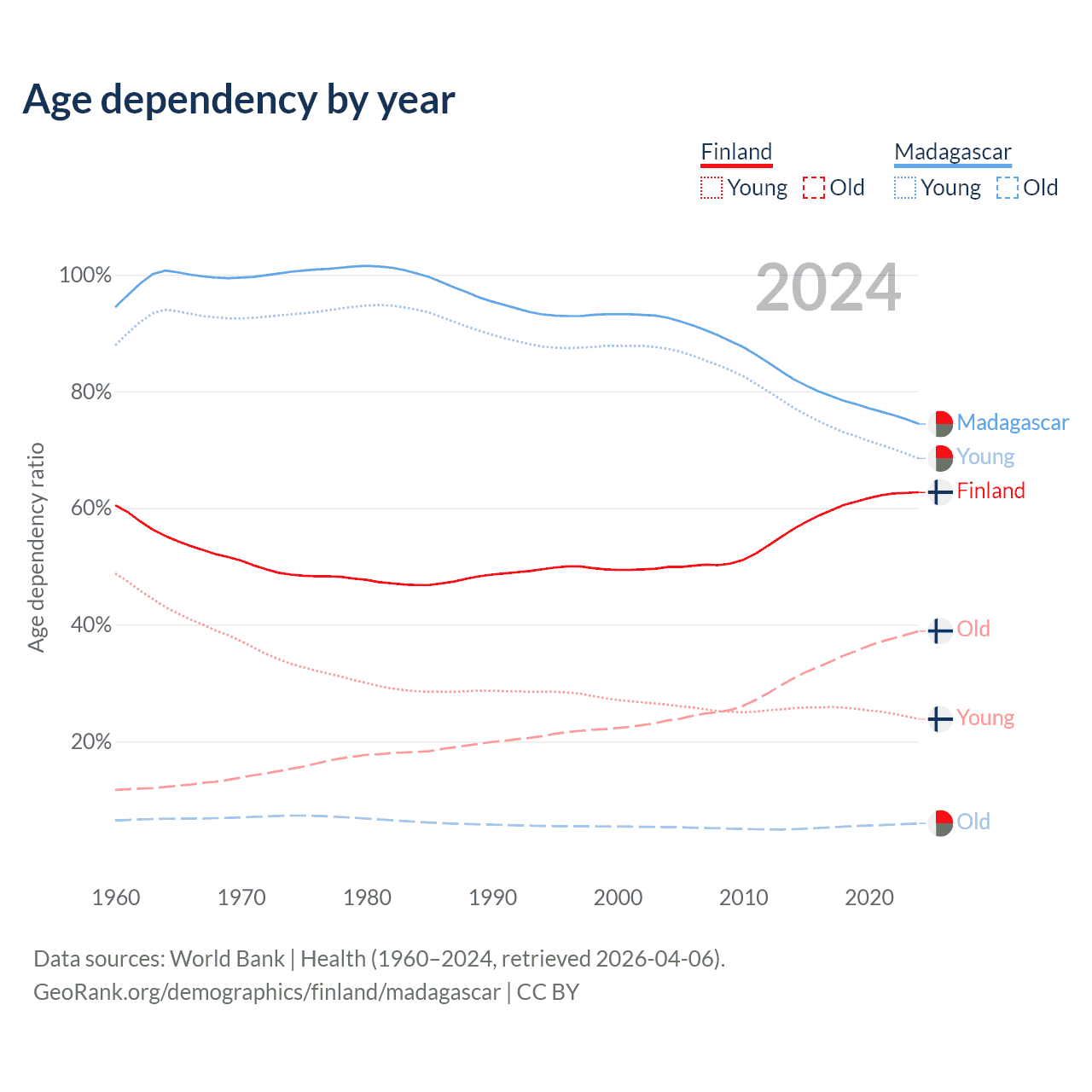- The share of old-age demographic (65+) in Finland is 23.9% vs 3.41% in Madagascar.