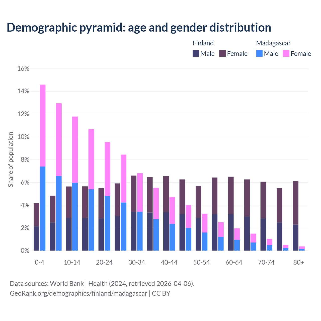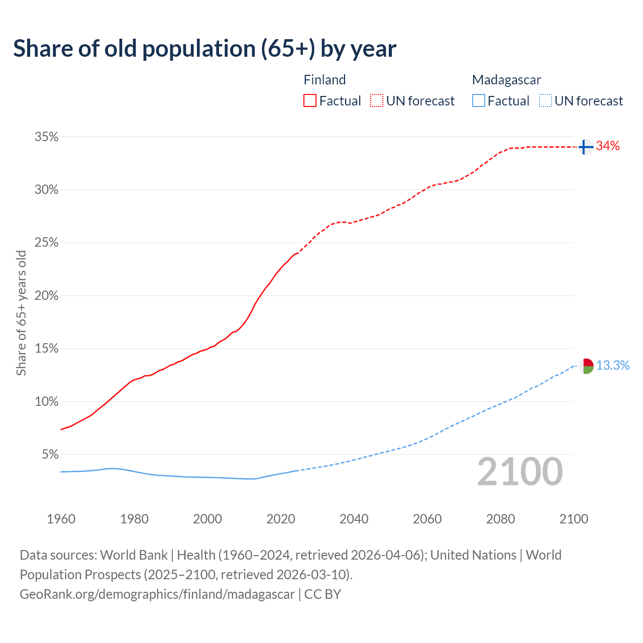 The share of older people aged 65 and over is 23.9% in Finland and 3.41% in Madagascar. Life expectancy in Finland compared to Madagascar .